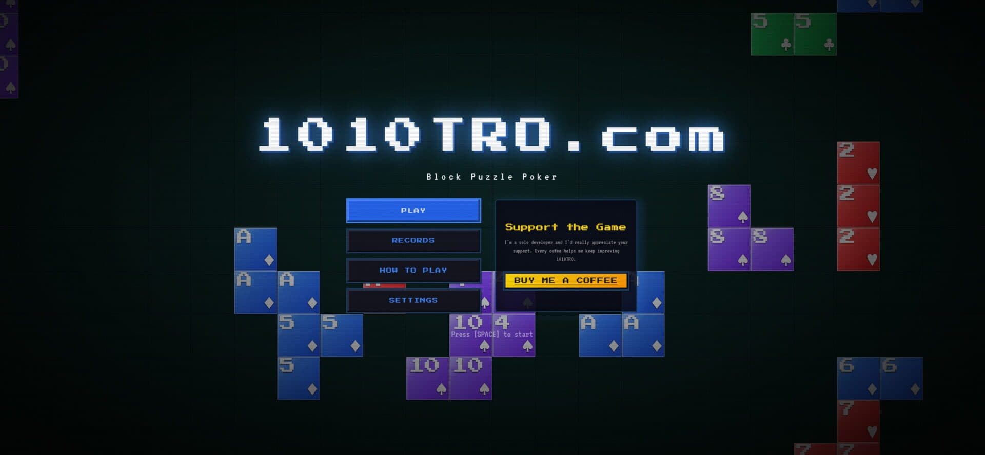 1010Tro is a free browser-based puzzle game that combines 1010-style block placement with Balatro-inspired roguelike mechanics. Place tetromino pieces on a 10×10 grid where every cell has a poker suit and rank, turning line clears into poker hands that trigger score multipliers. Manage an economy system where piece placement costs money, clearing lines earns it back, and between-round shops let you buy jokers to amplify your scoring engine. Features campaign mode with escalating antes and boss blinds, endless survival mode, and zen mode for casual play.