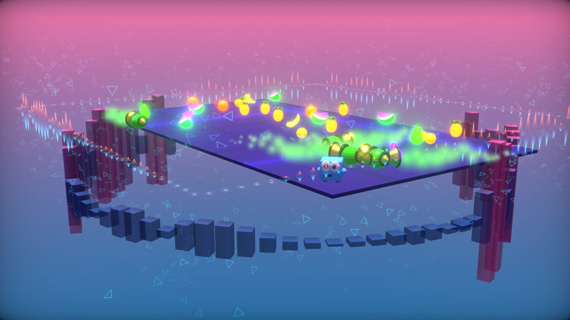 In this psychedelic arcade collect 'em up, you'll face wave after wave of brutal baddies out to stop Mr. Robot eating their precious fruits. When Mr. Robot (that's you!) eats a fruit it explodes, destroying any enemies within its blast radius. Careful though, because an exploding fruit can set off a chain reaction causing other fruit to explode filling the screen with destruction and more importantly, Points! The goal of the game is to survive as long as you can in the Neon Dunjun and score as many points as you can before your inevitable death. Simple controls, one more go gameplay, banging tunes... and Fruit! What more could you ask for?