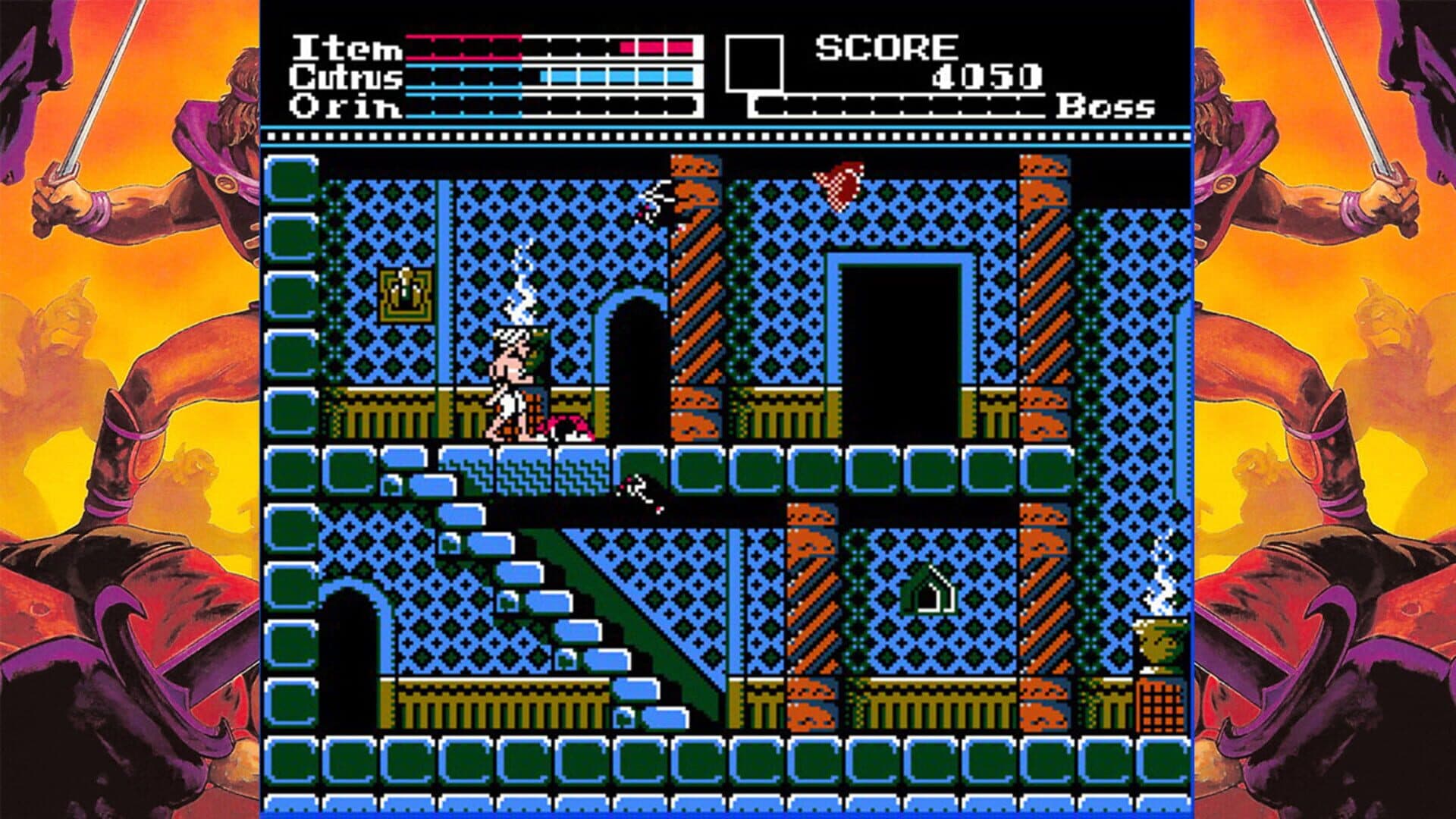 CONTROL MAN AND BIRD IN A FIGHT FOR THE EIGHT JEWELS OF POWER! After hundreds of years of chaos, mankind has finally emerged from the ruins of nuclear war. This world of the distant future has once again fluorished under the guidance of the Great King, who harnessed the power of the 8 Eyes to rebuild the planet. These strange jewels of power were formed at the eyes, or centers, of the eight nuclear explosions which nearly destroyed the Earth. In the wrong hands, the 8 Eyes could cause untold destruction...And now, they have been seized by the Great King's eight Dukes, in a desperate bid to gain control of the world for themselves. They have banished the King to the nuclear wastelands, and already their squabbling threatens to plunge the world into war once again! The task of retrieving the 8 Eyes falls to you, Orin the Falconer, the bravest and mightiest of the King's Guardsmen. With your fighting falcon, Cutrus, you must penetrate each of the eight Dukes' castles. There you will face the Dukes' soldiers, and battle strange nuclear mutants such as living skeletons, giant wasps, and mud men. You must defeat the monstrous Boss of each castle to retrieve the Jewel of Power he guards. Then, to complete your quest, return the 8 Eyes to the Altar of Peace to await the return on the Great King, so that he may finish the rebuilding of Earth. Your reward will be the the eternal gratitude of all mankind!