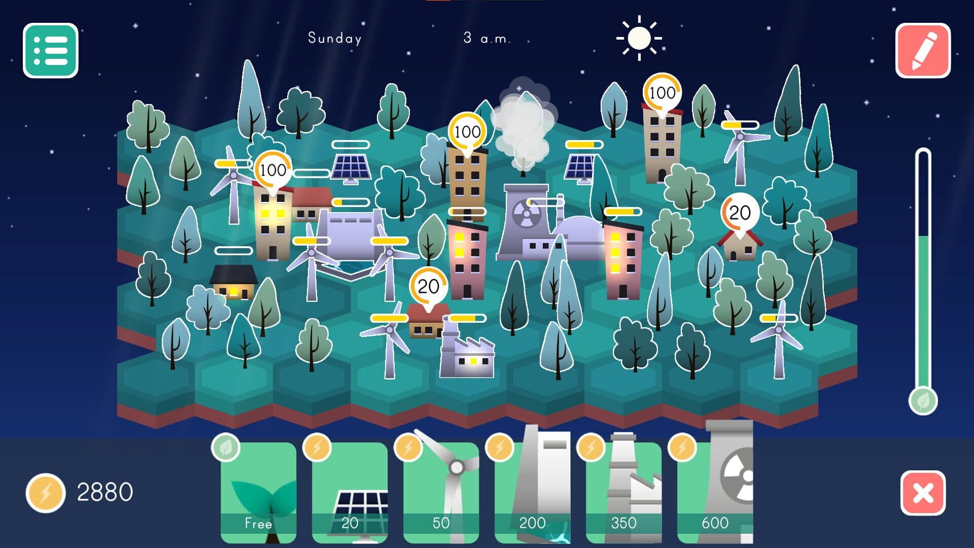 Join the green revolution! Relax and learn about clean energy in this cozy, minimalist 2D city-building strategy game. Build windmills, solar panels, and more to provide energy to villages and cities while protecting the environment. Let's work together to make 'A Better Tomorrow'!