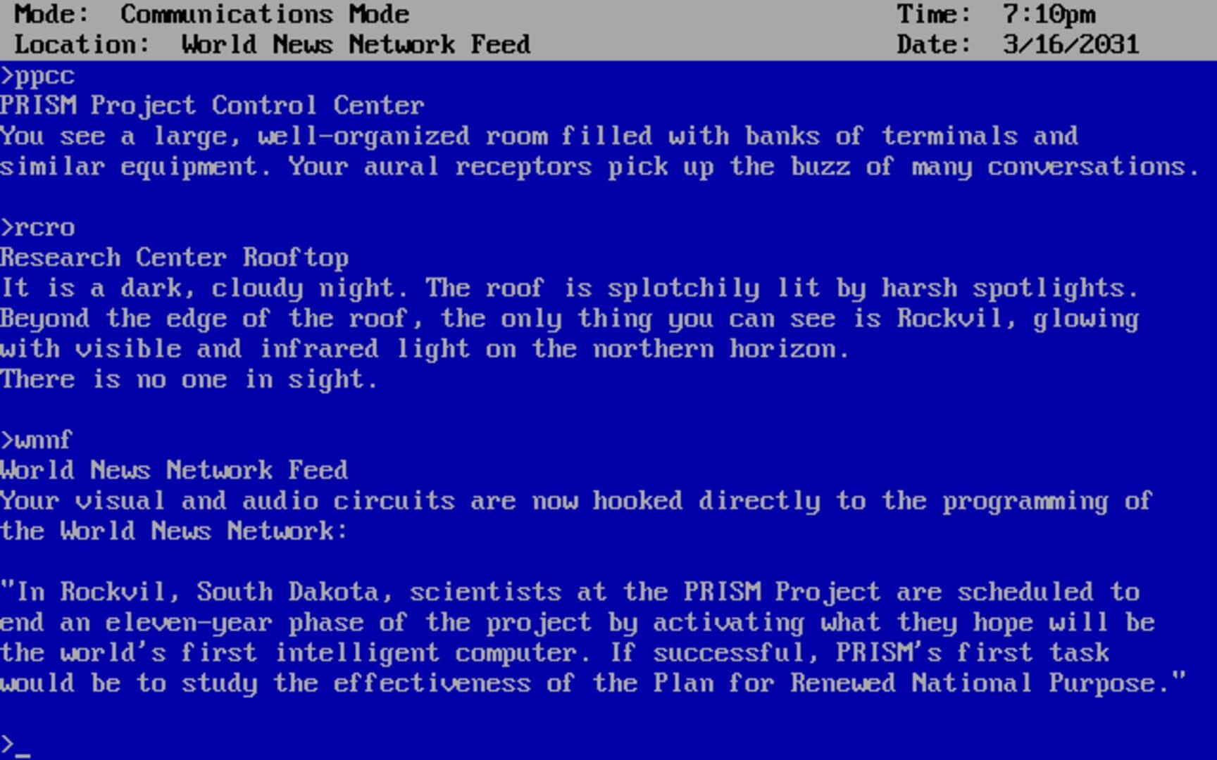 The story begins in the world of 2031, a world on the brink of chaos. The economy of the United States of North America (USNA) has been stagnating for decades. Crackpot religions are springing up all over the place. Crime and urban decay are rampant. Schools have become violent, chaotic places ill-suited for educating children. Today's youth frequently use joybooths to "tune-out" the world, leading in the extreme case to joybooth suicide, where a psychological addict wastes away in his or her private nirvana. The global situation is even grimmer. The calcuttization of the Third World has almost reached its limit, causing extreme overpopulation and poverty. This has created a climate ripe for East Bloc adventurism, exploiting instability and fanning the numerous flash points around the globe. The superpower race to build an impenetrable missile defense has ended in a tie, with the foreseeable but unforeseen result that an even more dangerous arms race has begun- a race to build miniature nuclear weapons, some as small as a cigarette pack, and smuggle them into enemy cities-a race which threatens to turn the USNA into a giant police state. Things are bad, and it appears that they can only get worse. So when Senator Richard Ryder, along with a small group of leaders from government, business, and the universities, announces the Plan for Renewed National Purpose, everyone is only too willing to embrace it. Only one thing stands between the Plan and its adoption: a test of its validity. That's why you have been "awakened" from your simulated life and had your true nature revealed to you several years ahead of schedule. You have been chosen to use your unique abilities to enter a simulation of the future, based on the tenets of the Plan, in order to check its effectiveness. The eyes of the world are on you.