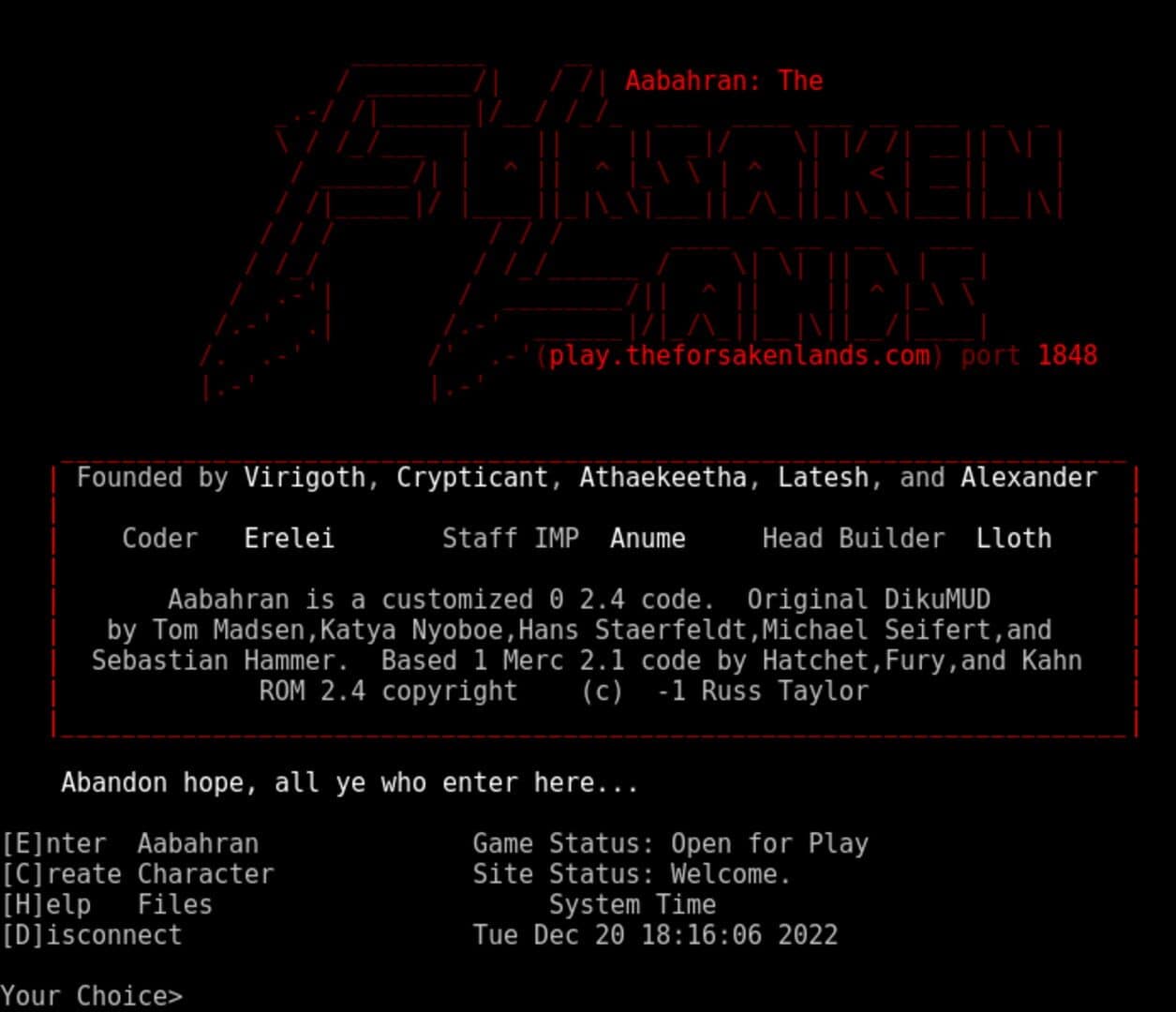 Aabahran is a multi-user dungeon, or MUD. A MUD is a multi-player computer game that combines elements of role-playing games, hack and slash style computer games and social chat rooms. MUDs are text-driven, where players read descriptions of rooms, objects, events, other characters, and computer-controlled creatures or non-player characters (NPCs) in a virtual world. Aabahran has been in existence since June of 2000, ranking it in line with many of the long-standing MUDs still in existence. Its world is rich, dynamic and exciting. It is also a roleplaying-enforced, playerkilling MUD. What this means is that in Aabahran, you are required to play a character to its full extent. Additionally, you may kill other players (after a certain rank and within our highly balanced playerkilling ranges). In fact, because Aabahran has a balanced rare & unique item system, you may need to kill other players in order to get that special sword or shield you’ve been looking for! The world is massive, with over 10,000 unique rooms for you to explore. Because of the variety of races and classes, the game remains fresh and exciting, and endlessly replayable.