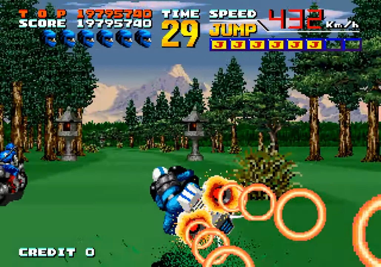 It is the future and motorcycle cops now use air bikes to patrol the streets and catch criminals. You are one cop, and over various missions you are to chase after various criminals and catch them within a time limit. Once all the criminals are caught, you then have to smash into the gang leader within a new time limit, decreasing his energy bar until it is empty. The gameplay of this title is similar to Chase H.Q.. Be careful, as the leader has a weapon and when hit slows you down.