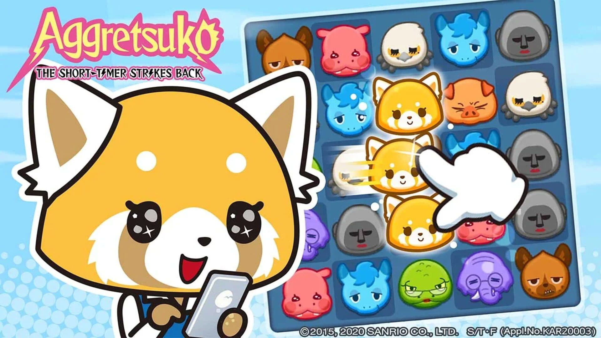 A match-three game based on the TV and Netflix series Aggretsuko. The titular red panda has been tasked by her tyrannical boss to decorate the various floors of the new office building. To do so you must earn her "stars" by completing levels of match-three puzzles. Each level has differently coloured tiles (modeled after the characters in the series), plus office-themed obstacles that require special criteria to be removed. The goal is to remove the obstacles and clear the level in a set number of moves. Along the way you unlock the various characters, which each have special abilities. You also unlock the one-minute episodes of the Aggressive Retsuko TV series. The game contains two types of currency, which are available for in-app purchase.