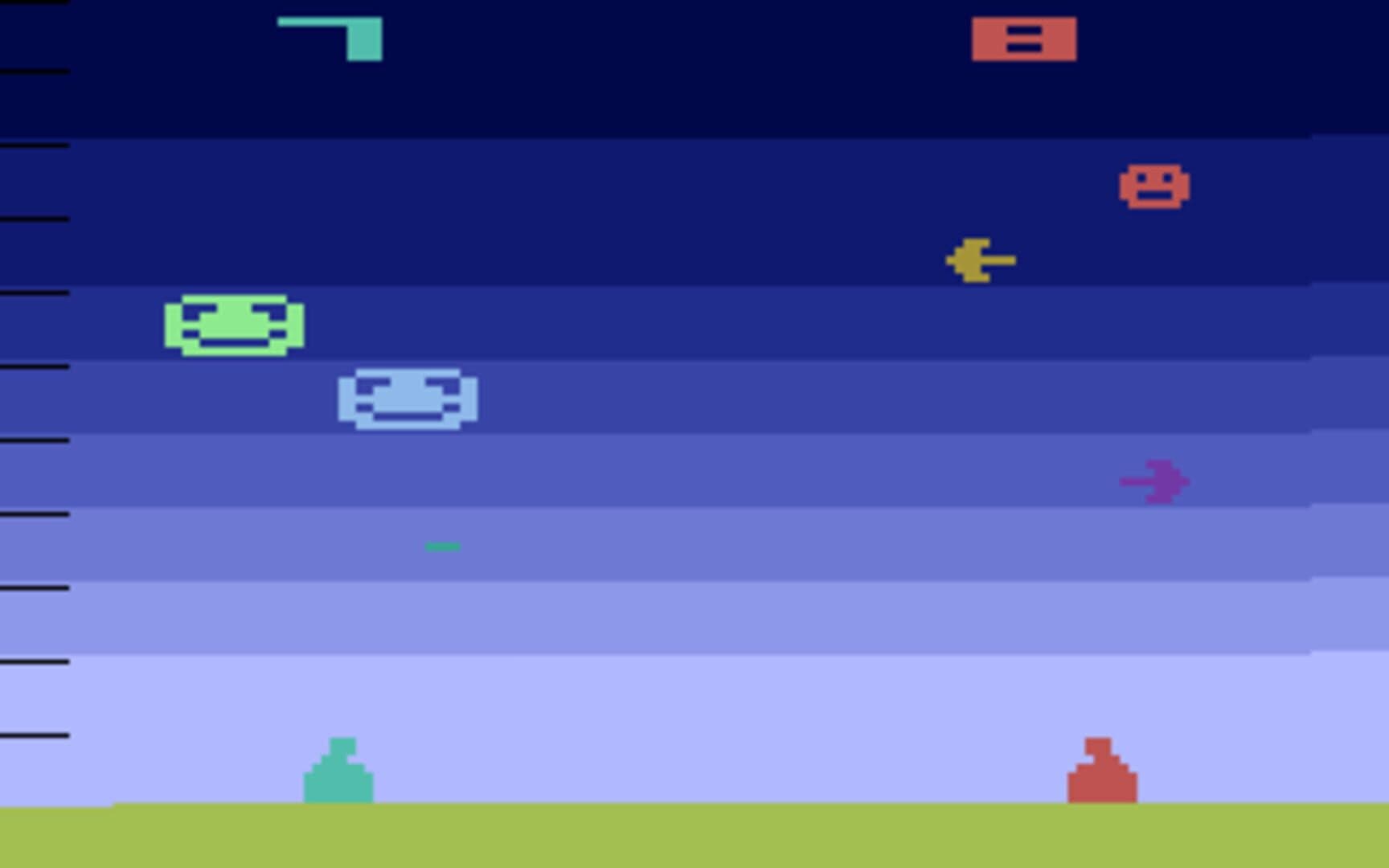 There are six basic types of game available in Air-Sea Battle, and for each type, there are one or two groups of three games, for a total of twenty-seven game variants. Within each group, variant one is the standard game, variant two features guided missiles which can be directed left or right after being fired, and variant three pits a single player (using the right gun) against a computer opponent, which simply fires continuously at the default angle or speed. In every game, players shoot targets (enemy planes or ships, shooting gallery targets, or each other, depending on the game chosen) competing to get a higher score. Each round lasts two minutes and sixteen seconds; the player with the higher score after time expires is the winner, unless one player wins (and ends the game) by reaching 99 points before the time is up.