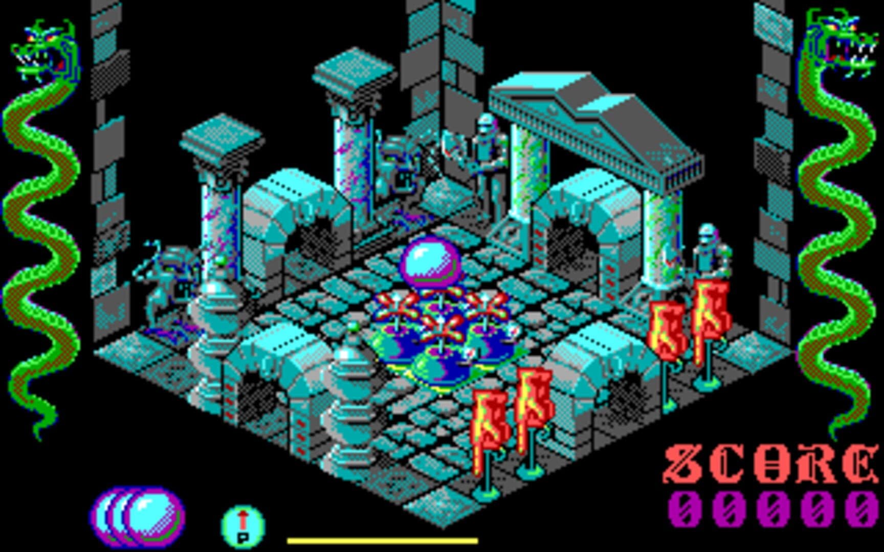 "Now you're really in trouble" said the evil Wizard. "I'm turning you into a ball of air and sending you into my mansion, with over 250 rooms, to search for the Spellbook that may give you the clues on how to transform yourself into a human again. It's not as easy as it sounds, for you, as the ball of air, have a slow leak, and you'll need to jump on an air pump in some rooms to remain inflated. Take heed, for if you pump up too much you will burst! If you are lucky enough to find the book in these rooms, you'll next have to pick up the objects I've left, such as: crosses, tins of beans, a Buddha, a dragon statue, a pumpkin, a flask, and even crates that you'll need to get over treacherous obstacles! This is your one chance for survival," he cackles. "Sounds easy" you laughingly boast to the evil Wizard. "Oh, does it now?" he sneers. "Well, I'm also putting spikes in these rooms that will take your breath away, as well as killer pads on the floor. You have no chance for success... Hee! Hee! Hee!"