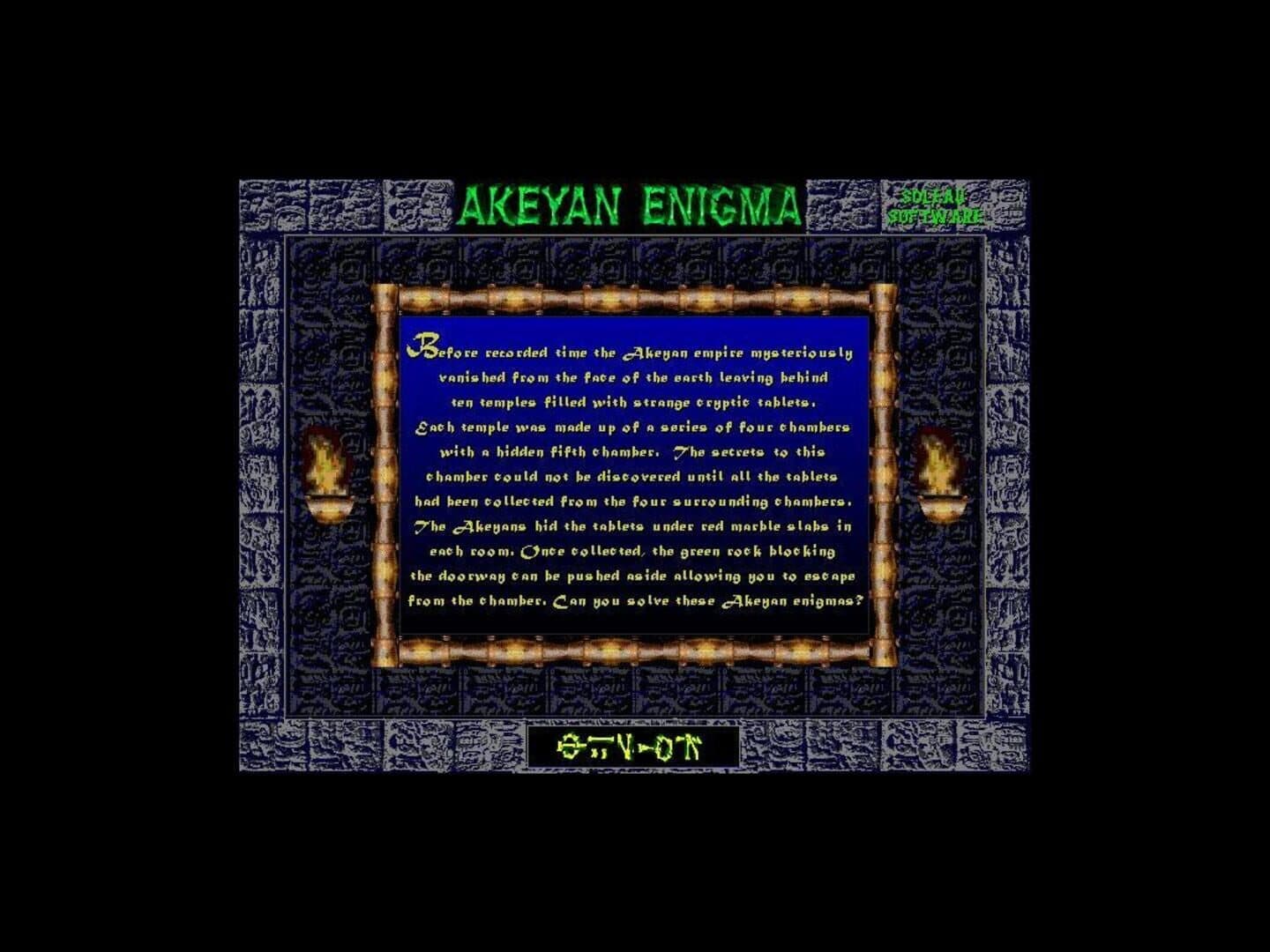 Before recorded time the Akeyan empire mysteriously vanished from the face of the earth leaving behind ten temples filled with strange cryptic tablets. Each temple was made up of a series of four chambers with a hidden fifth chamber. the secrets to this chamber could not be discovered until all the tablets had been collected from the four surrounding chambers. The Akeyans hid the tablets under red marble slabs in each room. Once collected, the green rock blocking the doorway can be pushed aside allowing you to escape from the chamber. Can you solve these Akeyan enigmas?