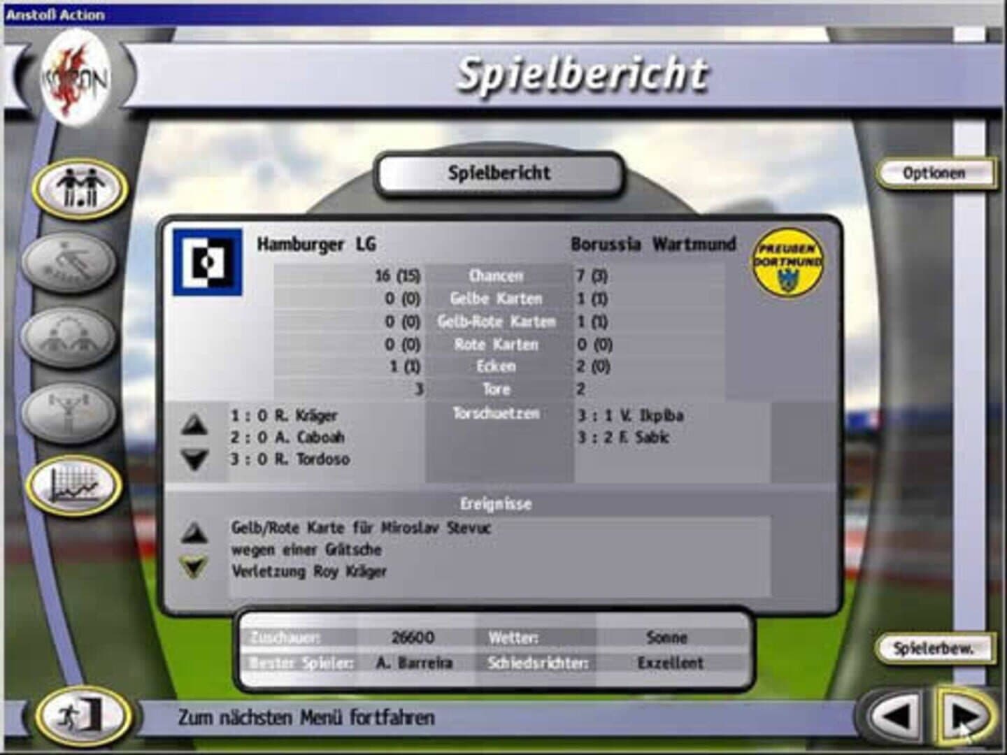 With Anstoss Action, a football simulation followed in 2001, the data of which can be integrated into Anstoss 3 to Anstoss 3 Action or A3 Action for short (comparable to EA Sports' “Football Fusion” technology). However, Anstoss Action could not really prevail against the competition from Electronic Arts and caused Ascaron's financial difficulties due to high development costs, which culminated in the first bankruptcy.