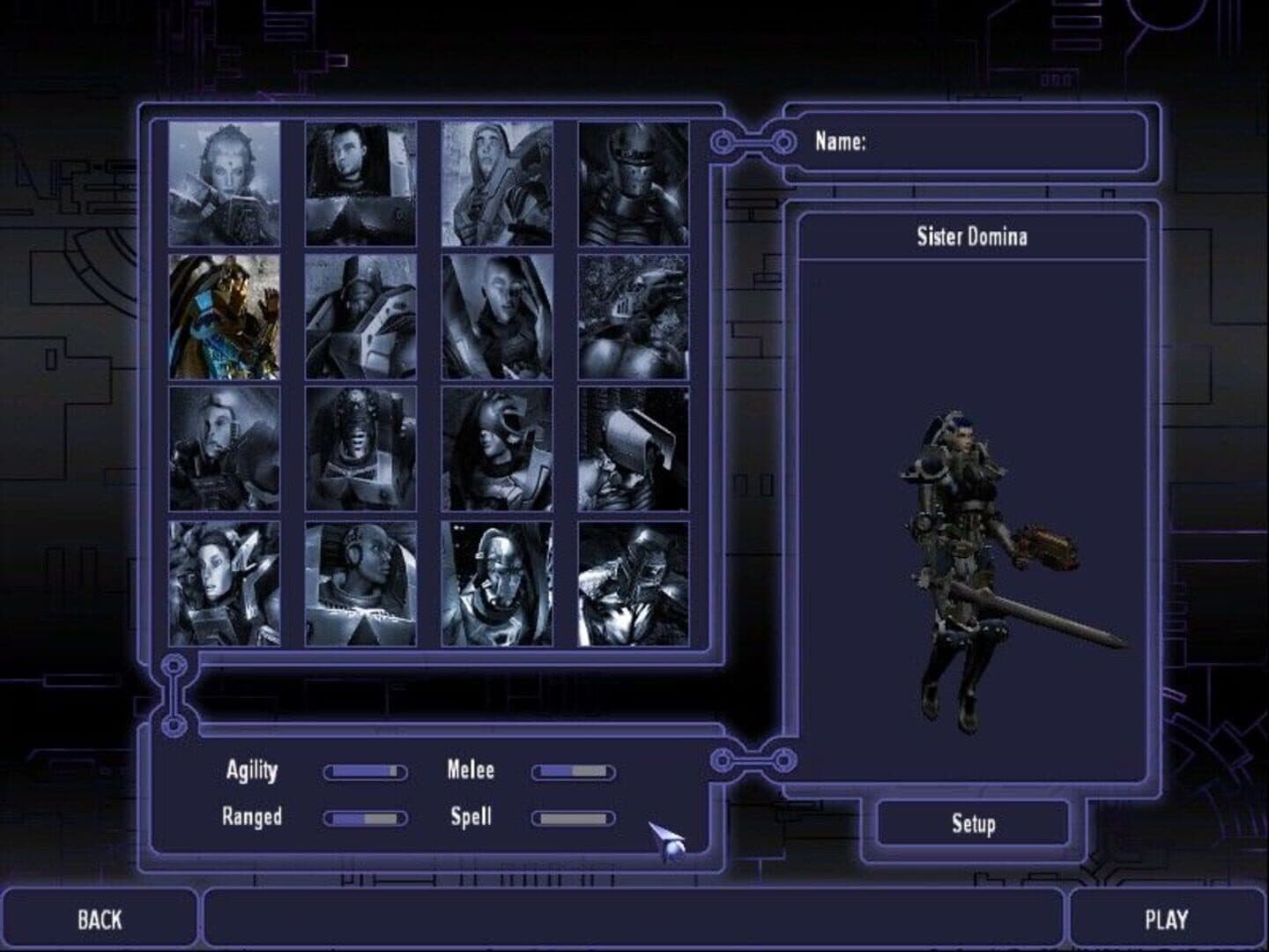 The forces of good and evil collide in this third-person gothic science fiction shooter. The single-player mode lets players select one of 16 characters and lead a team of holy avengers against the forces of Neo-Satan. Characters are skill rated and armed with guns, swords, and spells. Although the teammates and opponents are bots, each of the 18 levels is an objective based mission typical of multiplayer FPS games (rescue hostages, deliver packages, etc...). The player and bots re-spawn an unlimited number of times until the level objective is completed or failed. The forces of evil usually have a numerical advantage including a team of character type bots (comparable to the player's team) and an additional horde of mindless minions.