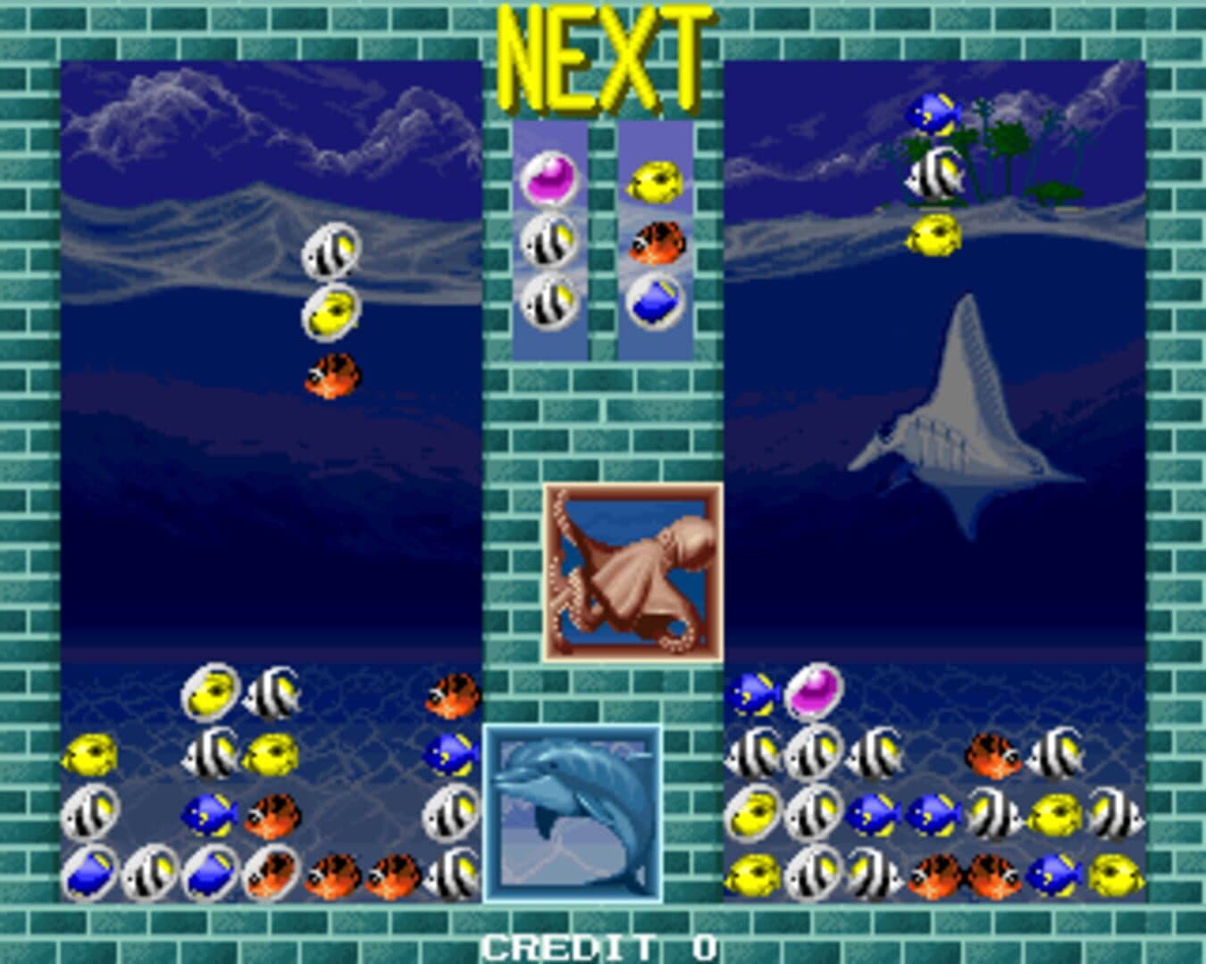 Aquarium is a Tetris variant puzzle arcade game released by Excellent System in 1996 in Japan only. Play consists of matching three fish shapes rows to make them disappear.