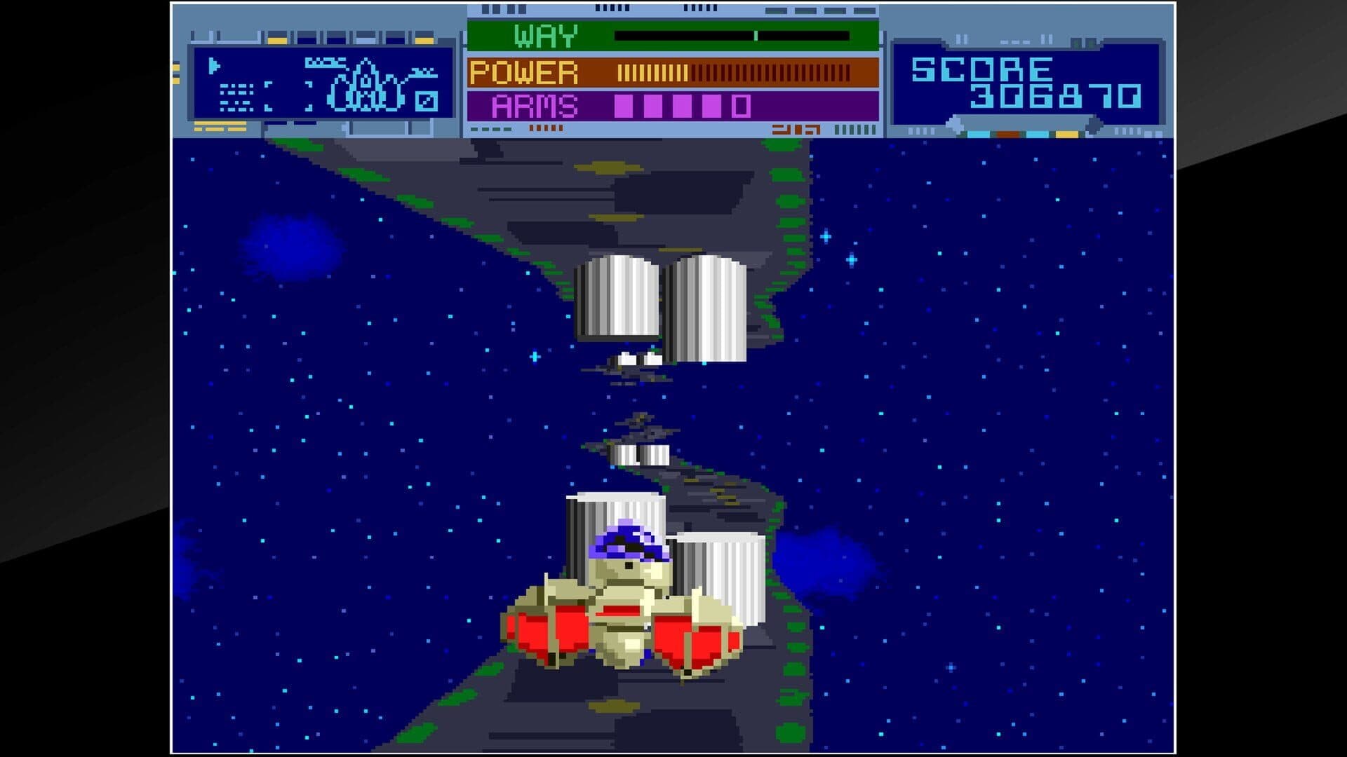 "Thunder Ceptor" is a shooter released by Namco in 1986. Your mission is to safely return to the Federation Base through the energy corridors that connect star systems.