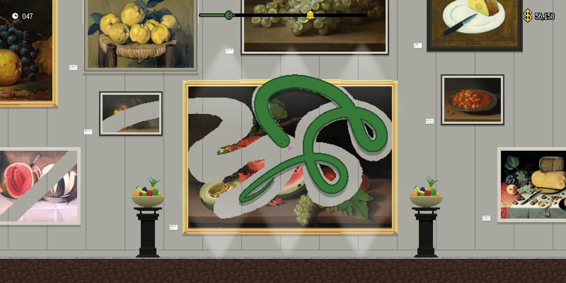 ART for Snakes is a single player snake-ish game by Splerp, Cheeseness, and lcl. Be a snake, eat the most expensive paintings you can before the time limit runs out. "Our gallery provides snake-friendly access to all floors. Please do not climb on or touch the exhibits (unless nobody is watching)." Use snake-like controls to move through and leap from painting to painting across a branching 4 course campaign. ART for Snakes is intended to become challenging as it progresses, but for players who'd prefer a more relaxed experience, there is a "zen mode" available that removes time constraints.