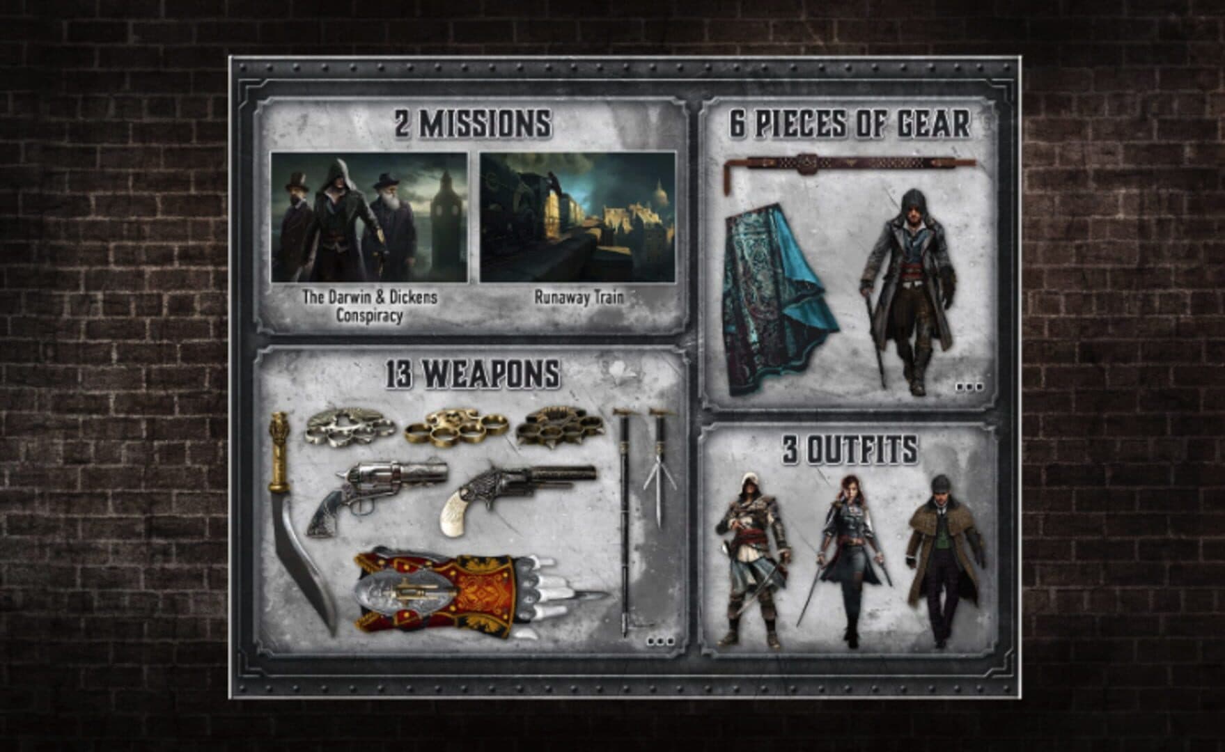 With over 45 minutes of gameplay, this pack contains missions, weapons and gear to expand your Assassin's Creed: Syndicate experience. Finally, this pack comes with a variety of equipment & weapons for both Jacob & Evie: 13 weapons, 6 pieces of gear and 3 outfits.