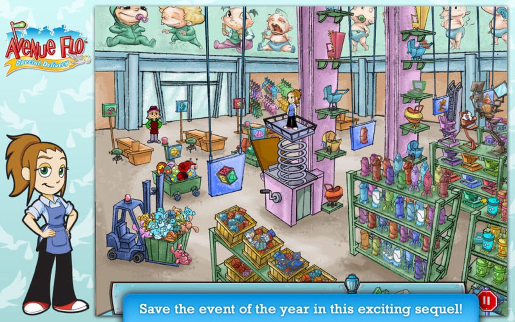 The DinerTown family is growing! Join Flo and the usual cast in Avenue Flo: Special Delivery, the sequel to the quirkiest adventure series ever. The surprise baby shower of the year is in disarray, and Quinn needs a hand from Flo to pull it off perfectly! Scurry across town with Flo, collecting missing items for DinerTown characters in need. Save the town’s highly anticipated celebration.