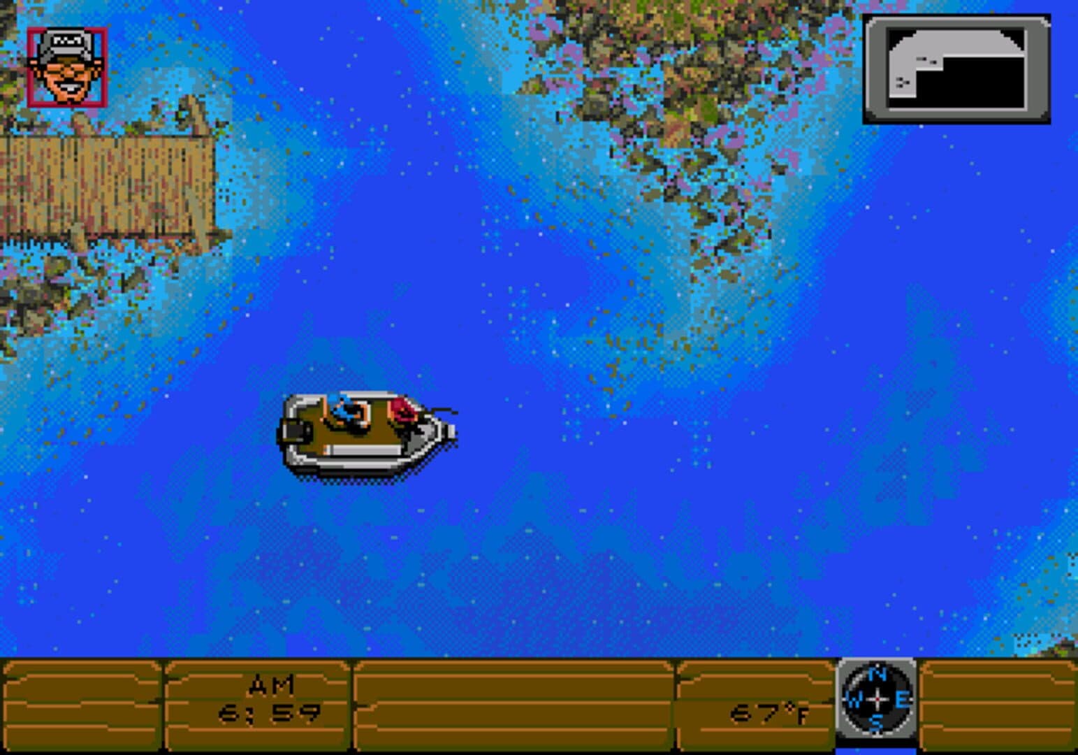 This game consists of five 3-day tournaments at four lakes. The mission is to catch as much large bass as possible. Once the day of the fishing tournament is over, the five largest bass that were caught get weighed and are compared to the other fisherman's catches. The one with the heaviest catch is the winner. The player starts off choosing an angler. Then the player can either go to the bait shop, practice pond, or start in the tournament. In the bait shop, choices of baits, lines, rods, reels, fish finders, and boat engines are available for purchase. The practice pond mode is just where the player can cut his teeth on the game mechanics without consequence. The tournament mode is the main part of the game. Players start out in a fishing boat. Some of the factors that can affect your fishing are temperature, wind speed, water clarity and time of day. After casting the line, the game goes from an above the lake view to a side view of the lake water depths. Then it's just up to the player to attract the fish with the bait, and after the fish is caught on the hook, reel it in.