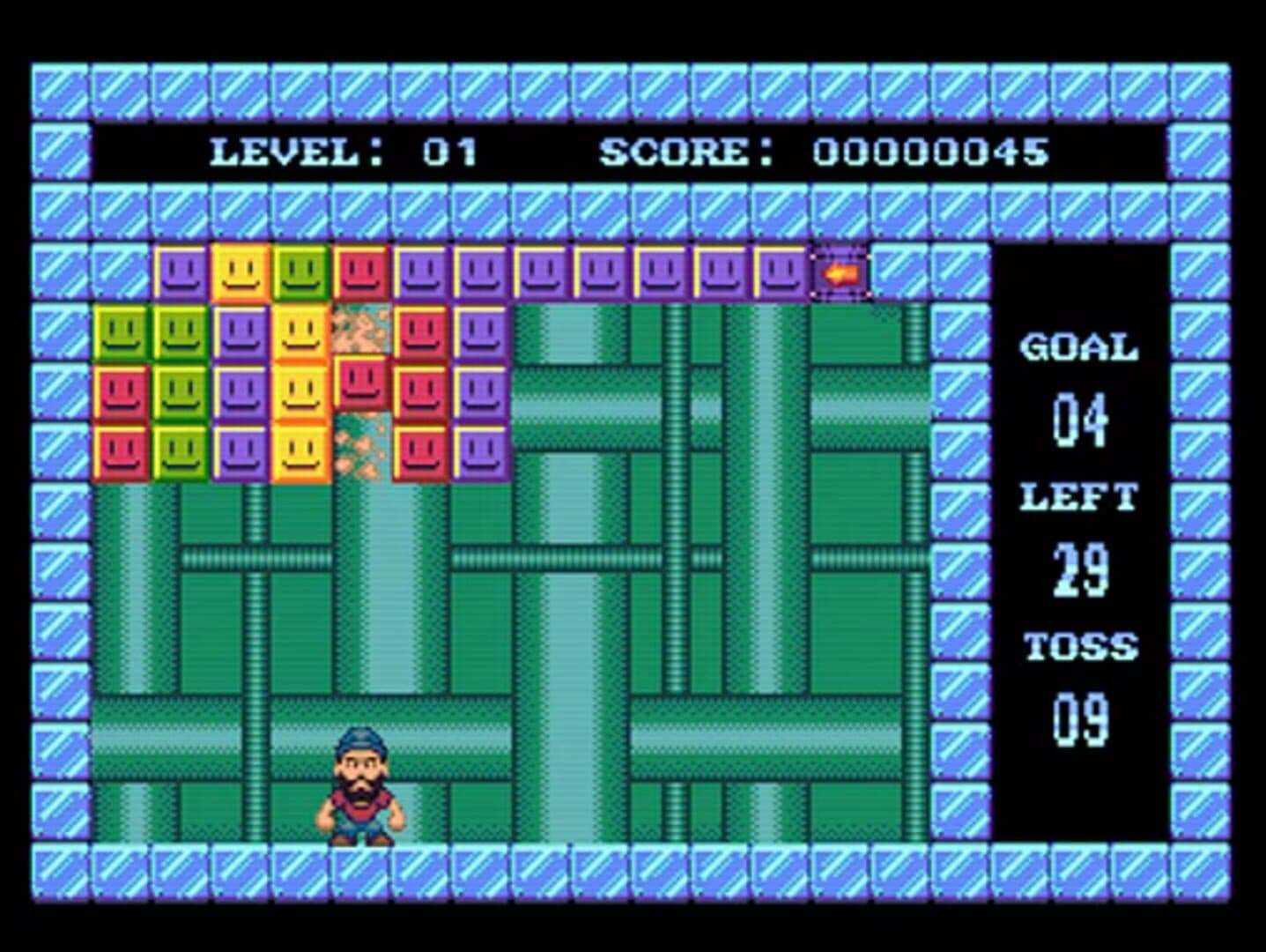 Your goal in Block'Em Sock'Em is to control John Hancock through 25 different levels to destroy boxes of the same color. Your aim is to get the block counter below the goal number with a limited number of tosses. If you toss a colored block and it hits another color, then your block will change to that color. There are three difficulty settings.