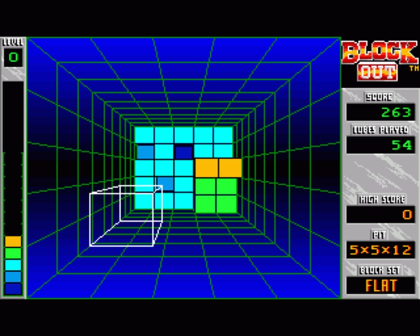 Blockout is a puzzle videogame, created in 1989 by Polish developer - California Dreams, designed by Aleksander Ustaszewski and Mirosław Zabłocki. The game is the logical extension of Tetris into the third dimension. In Tetris, the player manipulates a set of tetrominoes which fall into a two-dimensional pit (seen from the side). The aim is to solve a real-time packing problem by forming complete rows, which then disappear and score points. Poor play leads to incomplete rows, caused by inefficient arrangements of tiles; these rows do not disappear, giving the player progressively less space and less time to play subsequent pieces. Similarly, in Blockout, the player manipulates a set of polycubes which fall into a three-dimensional pit (seen from above; the pieces appear in the foreground and fall away). The pieces can be rotated around all three axes, and moved horizontally and vertically. The aim is to form complete layers.