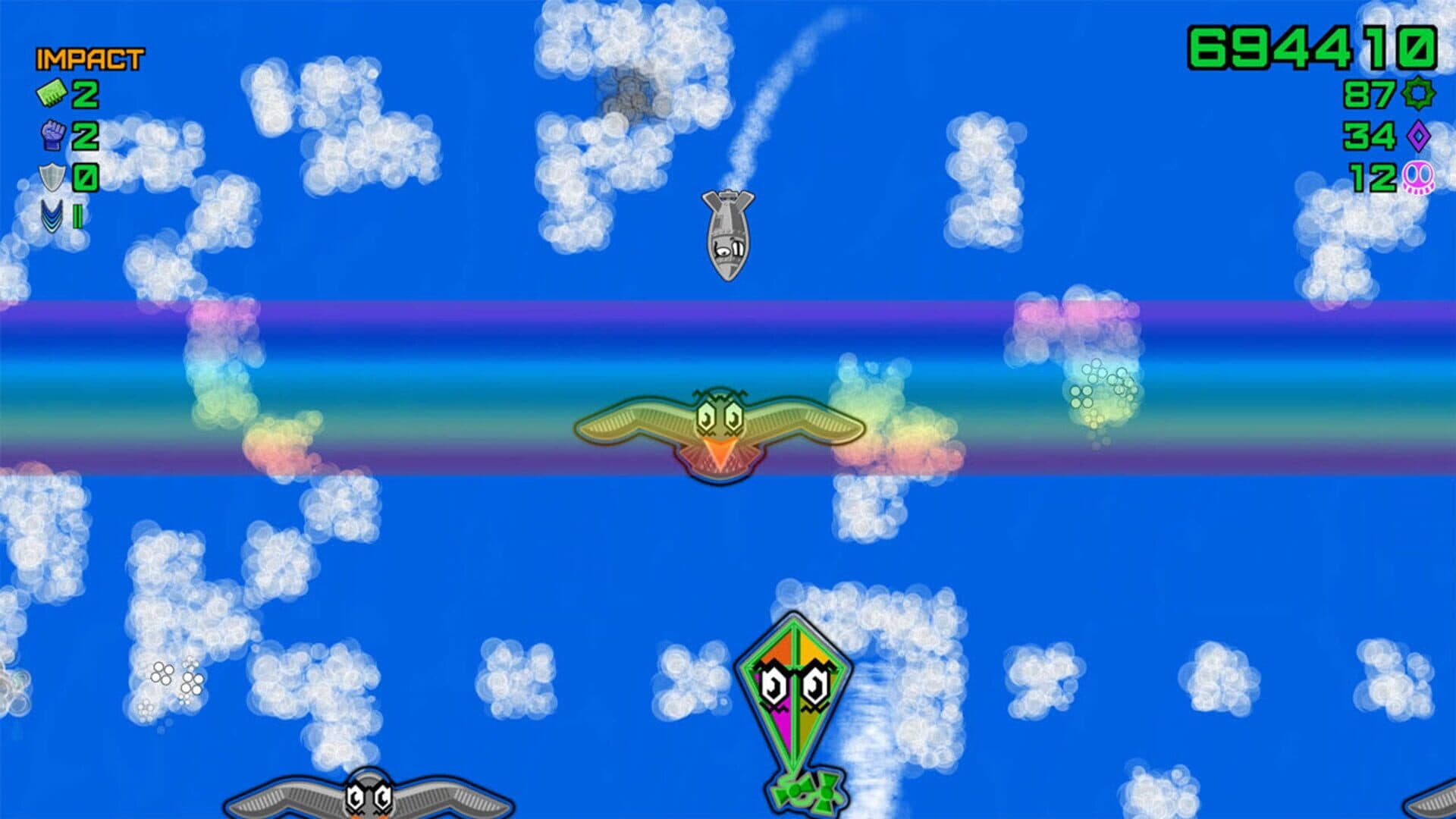 You play as a bomb that traverse three stages of Earth's atmosphere freely moving within the flight corridor towards the target cityscape, bashing various enemies with your super tough nose, gaining powerups, and "collecting" clouds to charge your retro thrusters.