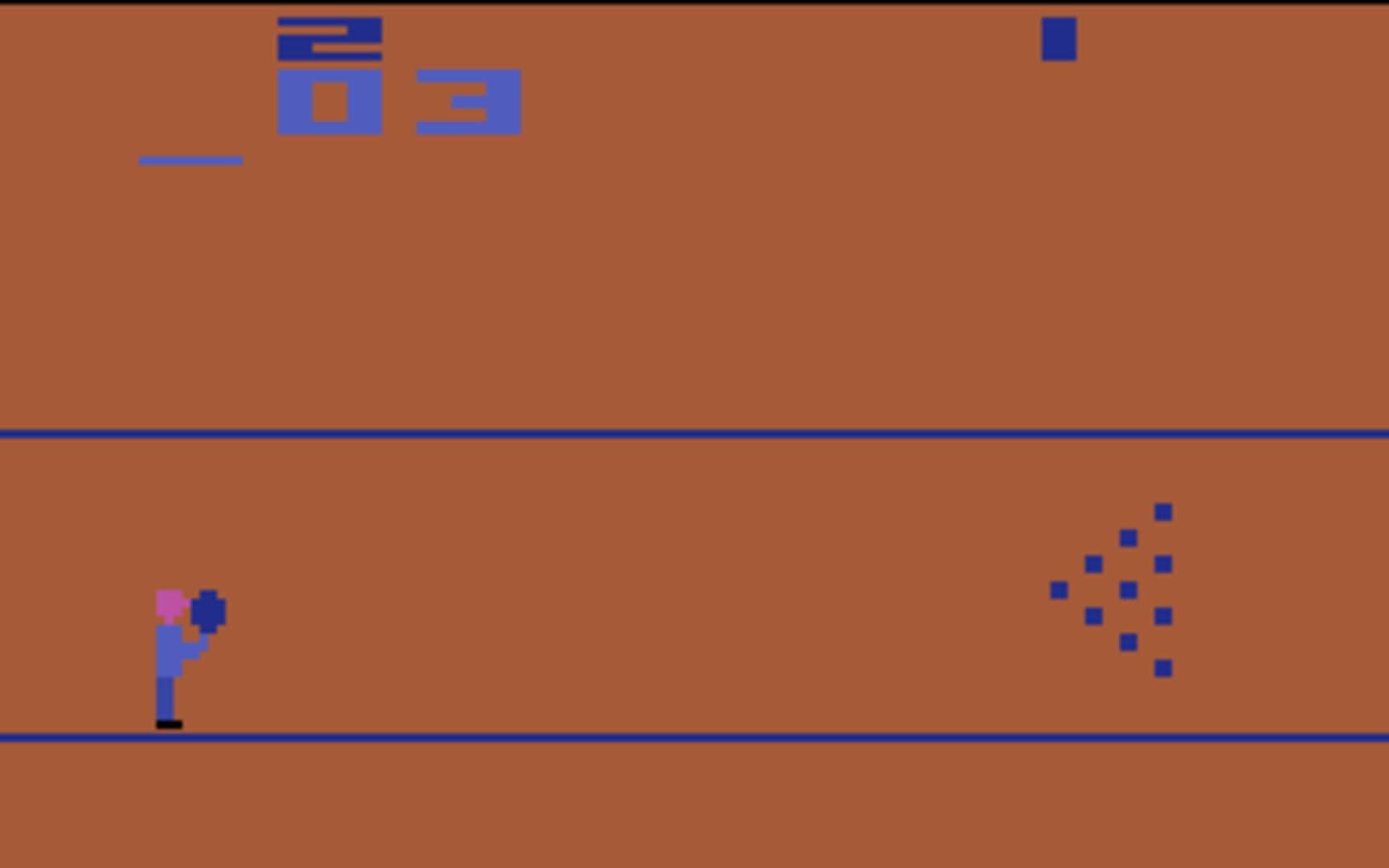The game is based on the game of bowling, playable by one player or two players alternating. In all six variations, games last for 10 frames, or turns. At the start of each frame, the current player is given two chances to roll a bowling ball down an alley in an attempt to knock down as many of the ten bowling pins as possible. The bowler (on the left side of the screen) may move up and down his end of the alley to aim before releasing the ball. In four of the game's six variations, the ball can be steered before it hits the pins. Knocking down every pin on the first shot is a strike, while knocking every pin down in both shots is a spare. The player's score is determined by the number of pins knocked down in all 10 frames, as well as the number of strikes and spares acquired.