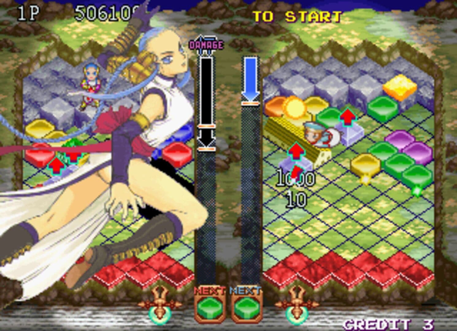 Builder's Block (known as "LandMaker" in Japan and Europe) is a puzzle game in which you must construct buildings and then eliminate them for points. Although a certain color can only eliminate itself, the object of this game is to match colored blocks together to form buildings. Once you have made a building, you can eliminate it by shooting a block on the corner of it. The larger the building, the more benefits you'll reap when you destroy it! The game can be played three different ways: Puzzle mode, Battle mode, and Arcade mode. In the Puzzle mode, you must travel to one of seven different courses and construct specific size buildings. You must not destroy the buildings in this mode. The object is to build cities for the specific course or region you're in and make the cities grow.