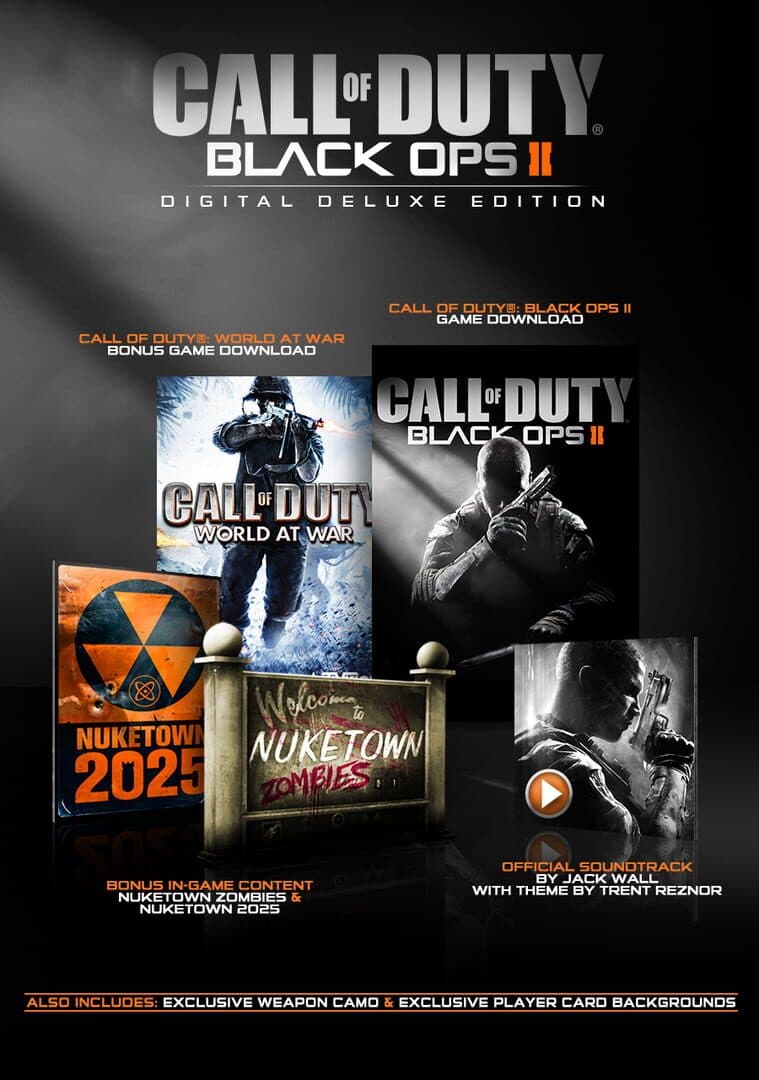 This Digital Deluxe Edition includes: - Bonus Map: Nuketown 2025 - Bonus Map: Nuketown Zombies - Weapon Camo - Two Player Card Backgrounds - Official Call of Duty: Black Ops II soundtrack - Call of Duty: World at War