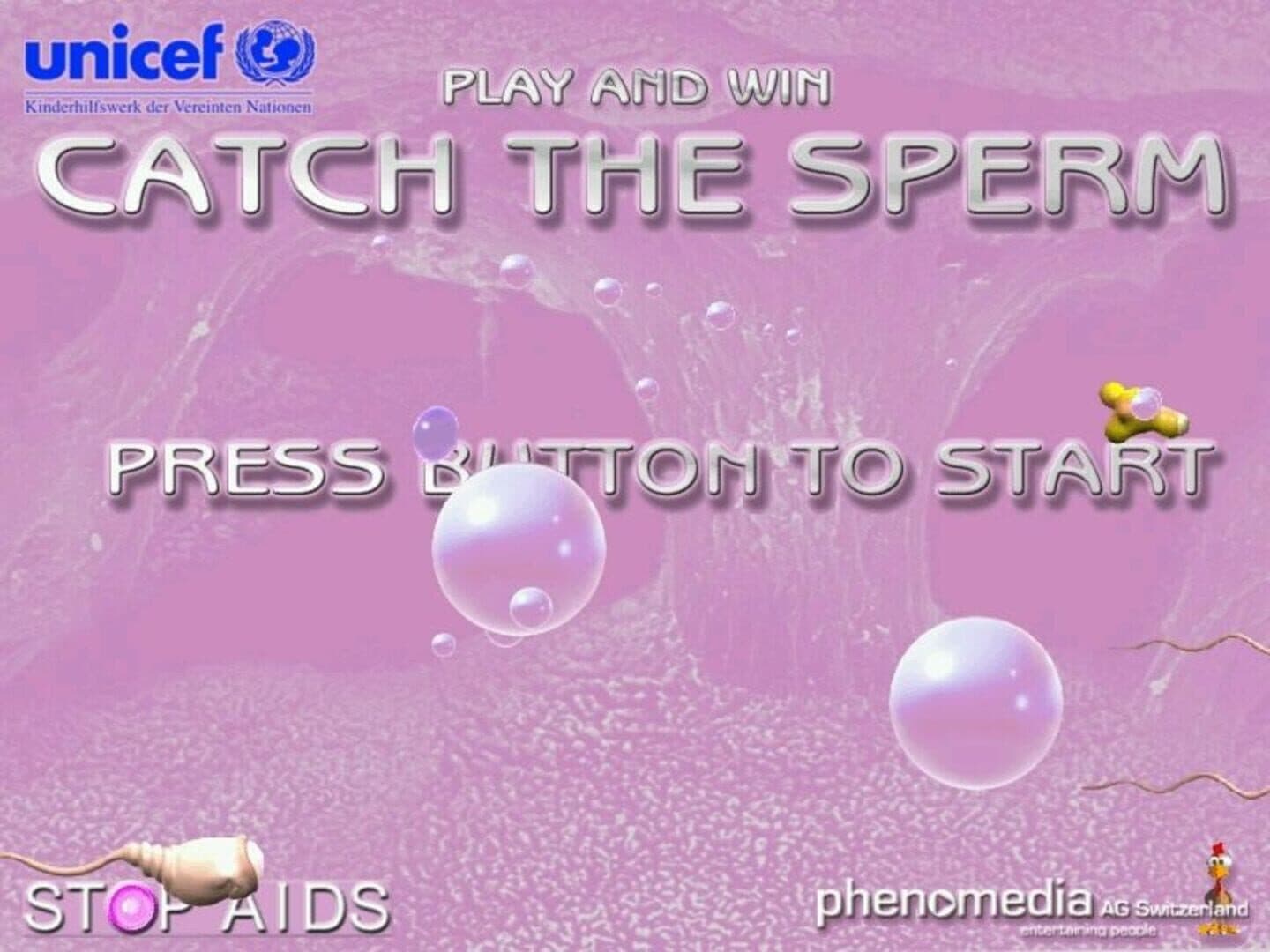 Catch the Sperm is a promotional game to raise awareness for HIV. The game was developed for the Stop AIDS campaign in 2001 (a joint prevention campaign by the Swiss Federal Ministry of Health and Swiss Aids Federation) in Switzerland. The player has to protect a couple having sex by shooting condoms at sperm cells and HIV viruses to catch them. The condom gun is located at the right side of the screen and can be moved up and down with the mouse, while sperm cells and HIV viruses are entering the screen on the left side. The goal is to catch as many sperm cells and HIV viruses as possible within 90 seconds. The game is immediately lost if a HIV virus reaches the other side of the screen. For each catch the player gets points, while each shot costs points.