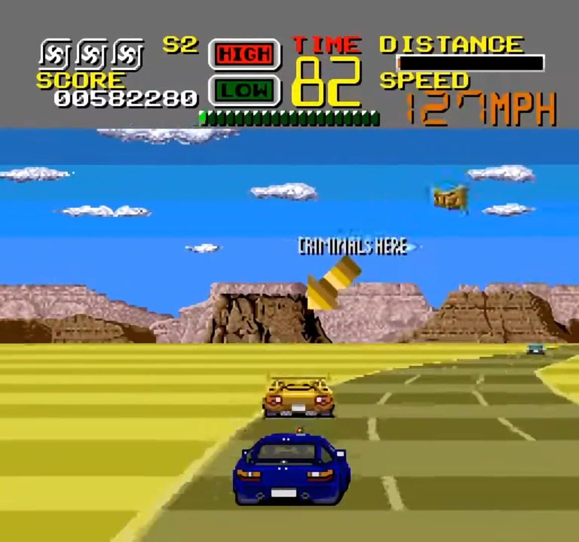 As an undercover agent of Chase Headquarters, your job is to patrol the streets and track down five criminals. You are given a mission briefing before you start which gives information on the suspect and what car they drive. Then you drive across the city without crashing into other cars, and catch up with the criminal's car. To arrest the suspects, you must keep bumping into their car until it is no longer functional. And you have to do this under a strict time limit. You can't afford to crash into cars or buildings or you waste time getting on the road again.