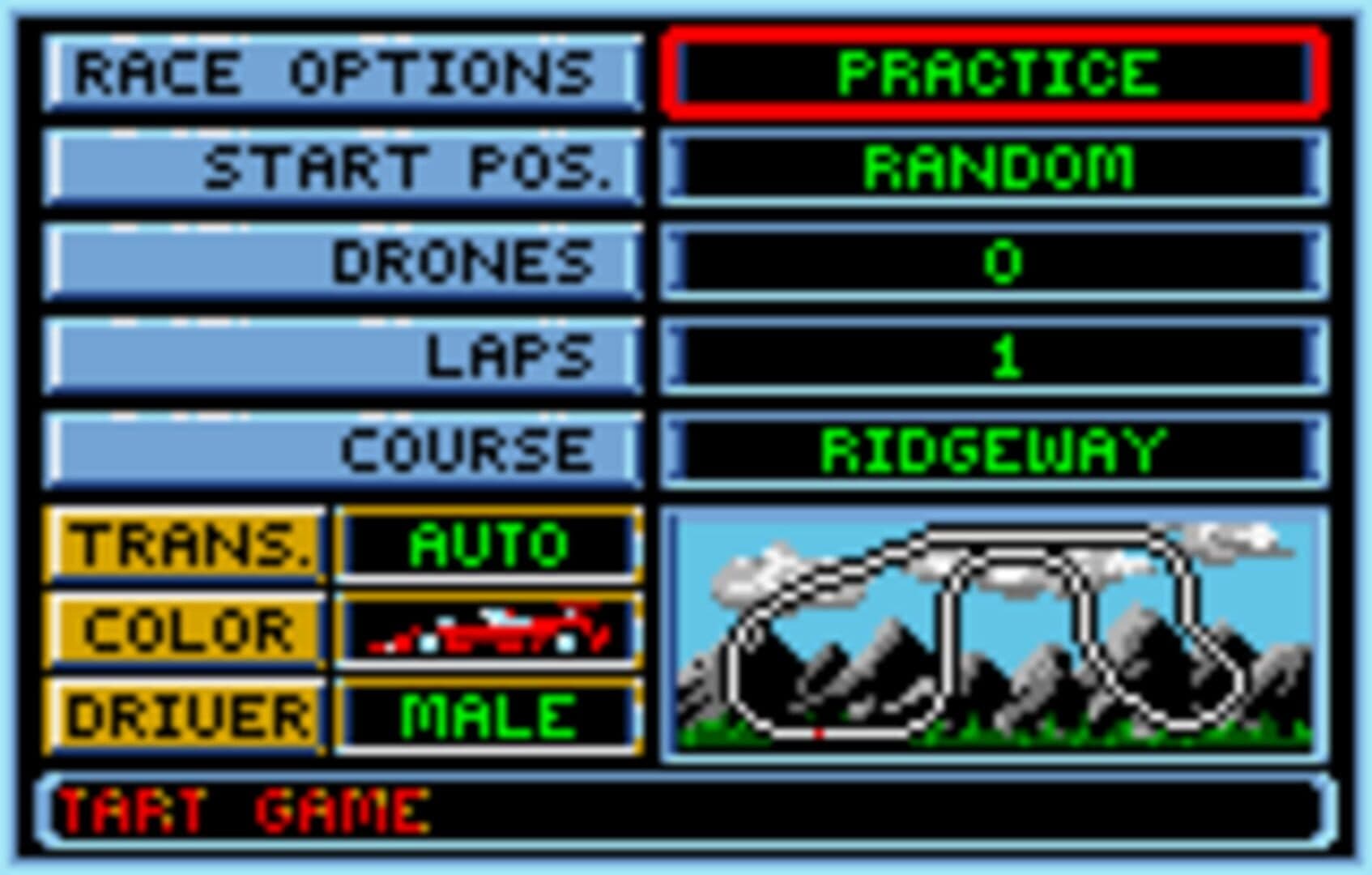 Checkered Flag for the Lynx is a racing game employing open-wheel racing cars (either Formula 1 or Indy-style depending on whether the box or the instructions are believed). The game features 18 tracks located in the American countryside or cities. Game modes include Practice, Single Heat and a 8-race Tournament. The start position can be set randomly or determined in a qualifying lap and the length of a race can be set between 1 and 50 laps. Also customizable are color of the car and the gender of the driver, both having only cosmetic effect. Gameplay is Pole Position style, with the own car seen from behind, a perspective view of the track, and cars and roadside obstacles displayed as sprites. A graphical representation of the track, lap times, speed meter and rear view mirrors are always in display. One button accelerates, another brakes. Left and right on the joypad steers while up and down shifts gears if manual transmission (either 4 or 7 gears) has been selected beforehand. Crashing into other cars sends the own car into a spin while hitting roadside obstacles (trees, bushes, rocks or animals) reduces speed to zero. The game can be played by up to six players via a ComLynx connection. If fewer players race, remaining slots can be filled by AI-controlled drivers for a maximum of 10 cars per race.