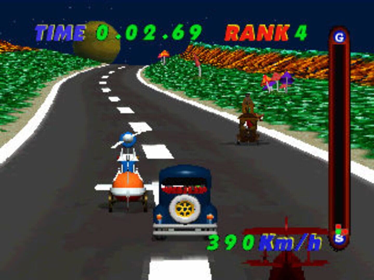 When Milk (Penelope Pitstop) is kidnapped, players have to explore the cosmos to rescue her. This game is a mixture of a graphic adventure and a racing game. In the adventure segments, players travel to different planets where they talk with people and solve puzzles using a point-and-click interface. Periodically, players will need to race to progress; these scenes feature a behind-the-car perspective as players try to get first place in high-speed chases.