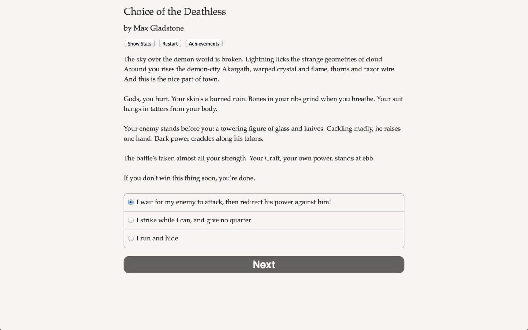 Battle demons and undead attorneys, and win souls to pay back your student loans! At the elite demonic-law firm of Varkath Nebuchadnezzar Stone, you'll depose a fallen god, find romance, and maybe even make partner, if you don't lose your own soul first. "Choice of the Deathless" is a necromantic legal thriller by Max Gladstone, Campbell Award-nominated author of Three Parts Dead and Two Serpents Rise. The game is entirely text-based--without graphics or sound effects--and fueled by the vast, unstoppable power of your imagination. Explore a fantasy realm with a rich and evolving backstory, based on the novels published by Tor Books.