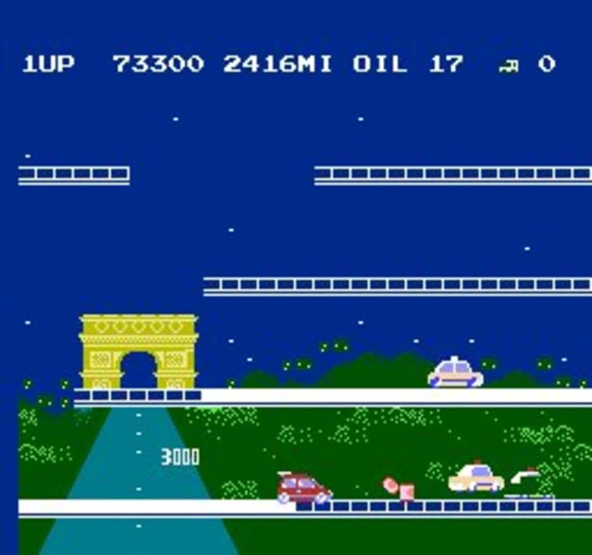 City Connection is a 1-2 player comedic racing adventure platform game in which you control a car that can never be stopped. The object of the game is to drive through a series of cities and paint every part of the roads in each city as proof of your visit to that city. City Connection was remarkable for its time in that each location had its own background and music which was a variation on the main theme of the game. There are twelve locations: Manhattan, the Grand Canyon, Easter Island, Paris, Neuschwanstein Castle, London, Sydney, Egyptian temples, and cities in India, Holland, China and Japan.