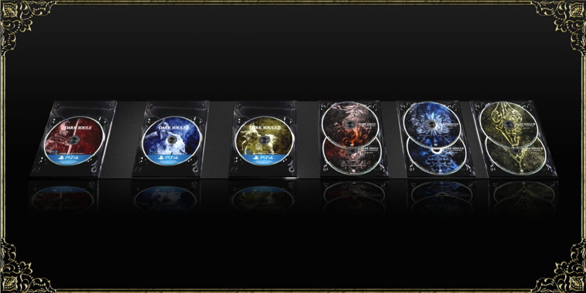 This edition includes the following: - 3 games (Dark Souls: Remastered, Dark Souls II: Scholar of the First Sin and Dark Souls III: The Fire Fades Edition) - Original Soundtrack x 6 - Trilogy box original bookends - Dark Soul Encyclopedia x 3 - Memorial art set: Special Frame (1) Special art (10 sheets) - Special disc case