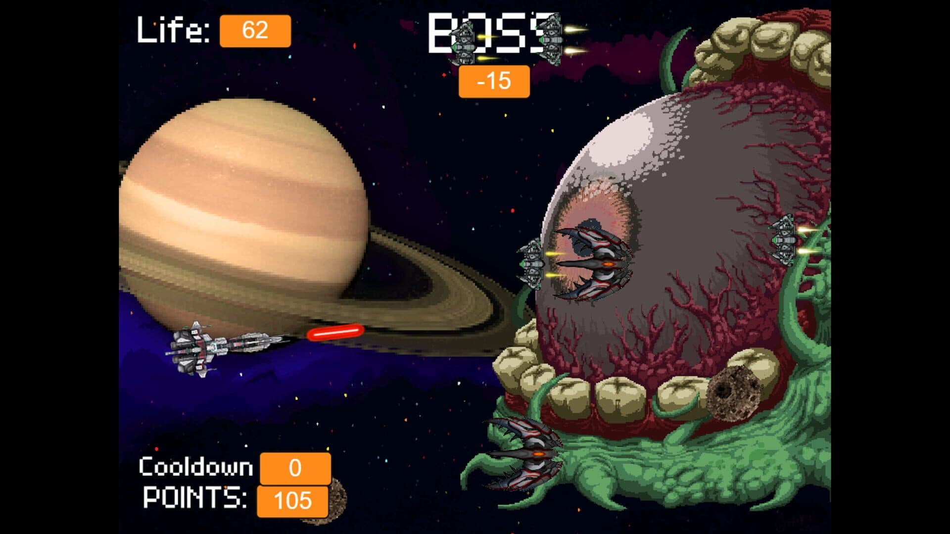 this small game was made from the idea of 3 friends for a school project, the game is a boss battle that starts when you reach 100 points, in it you are the last hope of protecting the planet from an alien invasion, so be careful !