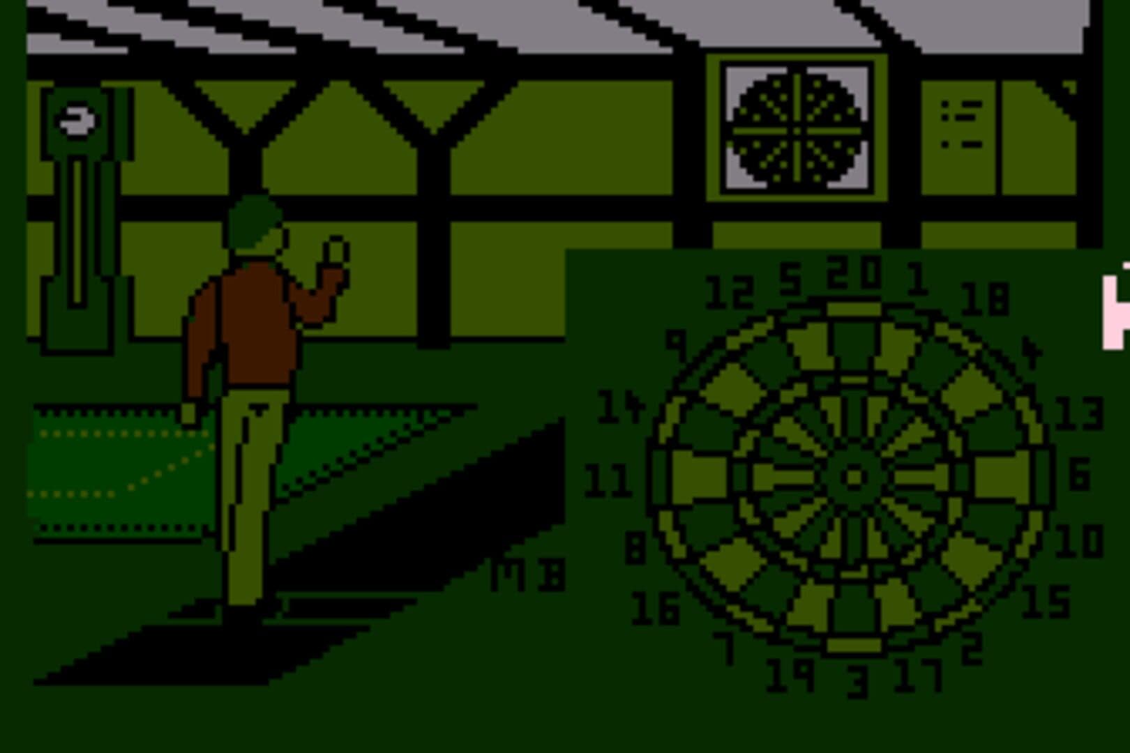 Darts is a 1-player skill game for the 8-bit Atari. The player controls a hand, which they must position on a dart board to score points. There are 10 levels of difficulty, which determine the shakiness of the throwing arm. The player also sets the level of the computer opponent. The player counts down points from 1001, 905, 501, or 301. The first player to reach a score of 0 is the winner, and the scoring points must be a double. The player can choose to require a double at the start of the game.