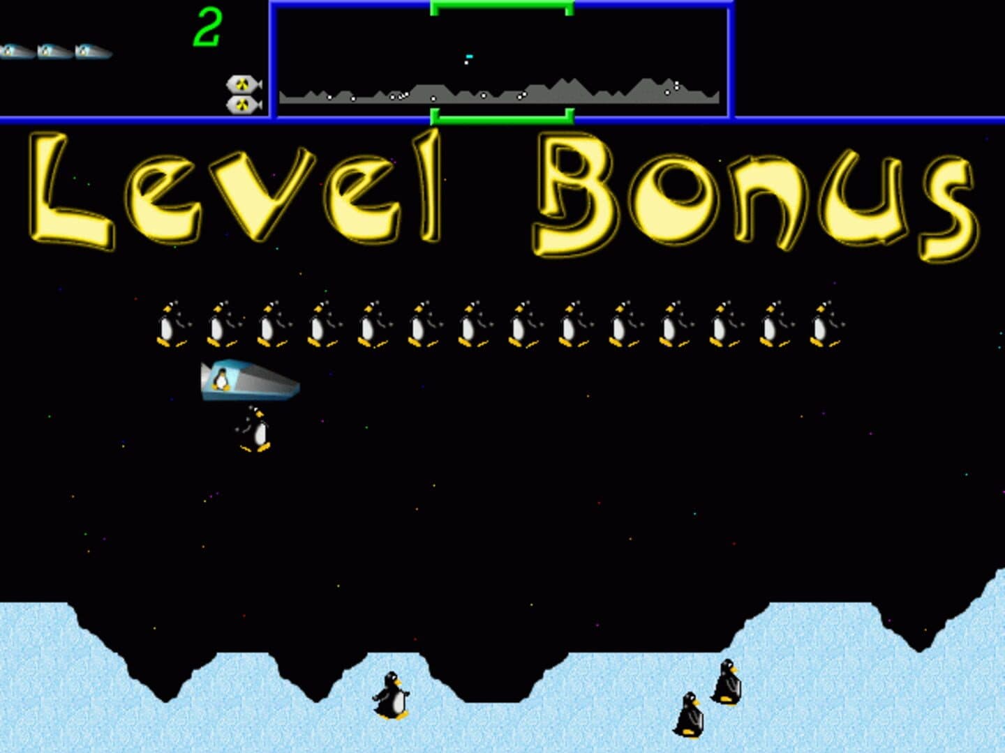 Defendguin is an arcade game developed by Bill Kendrick. Released in 1999 for Linux and later 2002 for Windows. It is a game based on the arcade game Defender with featuring the Linux Mascot Tux. The game is almost an exact copy of Defender with the only differences being that there is an optional boss and an ending sequence. It has been ported to other systems by the open source & linux community. The synopsis is that Tux is tasked with saving the penguinoids from being captured and mutated by a variety of aliens.