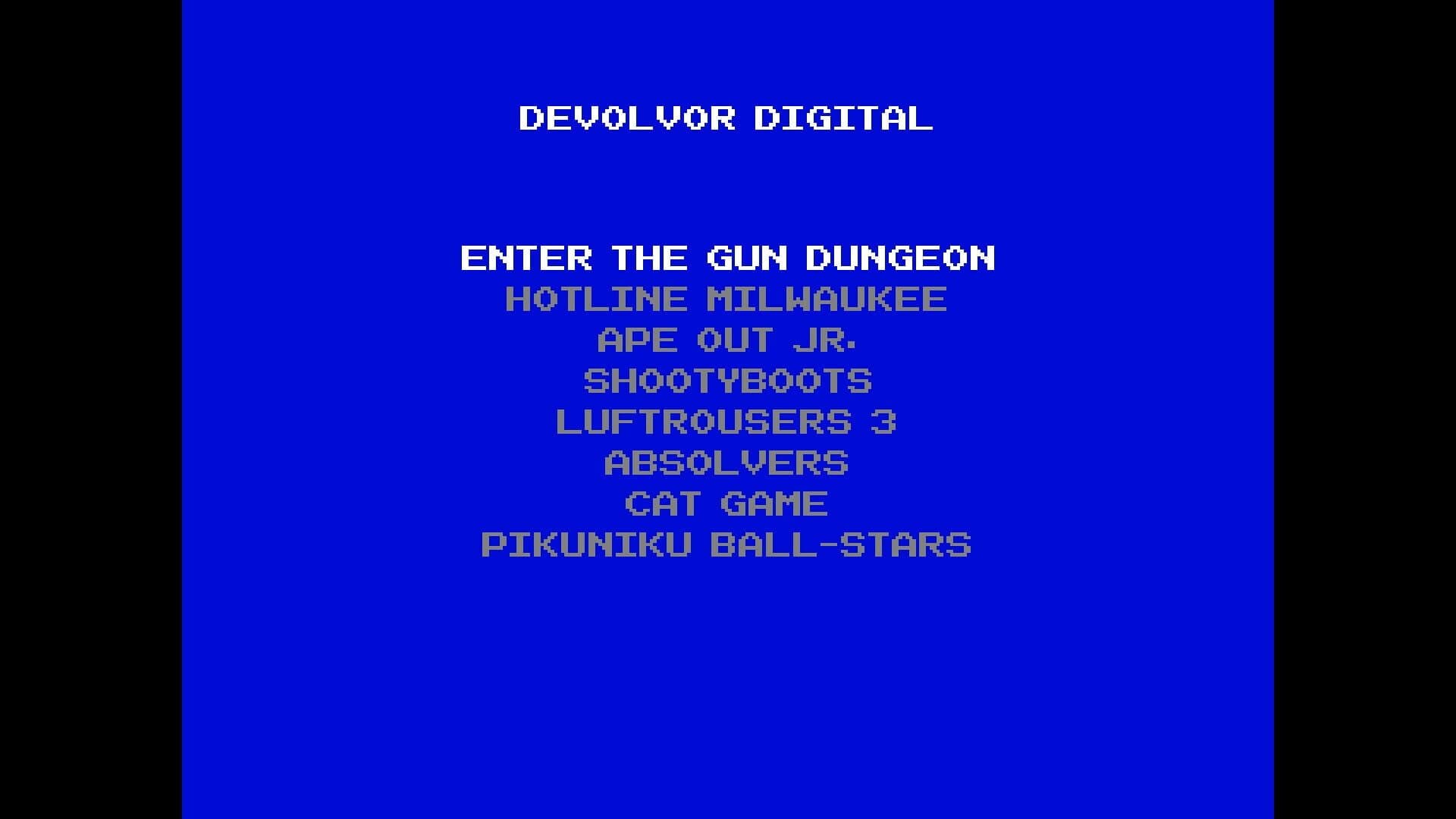 Devolver Bootleg contains eight original rip-offs of Devolver Digital games including: Enter The Gun Dungeon Imagine a dungeon crawler but instead of swords it’s guns. But also everything is made out of guns and bullets and stuff. Like, everything. Hotline Milwaukee Brutal, fast-paced, stealth action and a whole lot of blood. From your garbage person apartment in historically interesting and relevant Milwaukee, pick up the phone, and answer the call--of murder. Follow instructions and follow the stairs deeper and deeper into the mysterious basement. Where does it go? Who are you? Ape Out Jr. Escape out of ape prison in this classic arcade-style platformer where you play as an orange gorilla who will kill everyone so he can to see his dad again. Grab unsuspecting guards to use as weapons and shields in this completely original idea set to an interpretive chiptune jazz drummer soundtrack. Please, Ape Out was my father’s name. Shootyboots It’s the never-ending story of a young boy falling down a well, wearing a giant boot as if it was overalls, which also is a gun. Collect gems, squash and shoot the fauna, fall deeper into the infinite well, and wear some other equally large and ballistically designed shoes. Super Absolver Mini: Turbo Fighting Championship (2 Players Only) A competitive fighting game where you play as your choice of one of four masked combat disciples. You choose two special moves. You fight two rounds. The winner is absolved of the obligation to ever have to fight again, but probably will anyway because the one true resolve of the flesh is a fist colliding with it. Catsylvania It’s a cat inside of a suit of armor. It’s a cat...In full plate armor. What else do you want? PikuBiku Ball Stars (2 Players Only) Everybody’s favorite red thing with legs is back and ready to sink some baskets with a friend. Nothing but net baby. Slam freakin’ dunk. Luftrousers Hello, I am Rami Ismail, ½ of Dutch independent game development studio, Vlambeer. We made a version of Luftrausers that had a typo, and JW left the thumbdrive containing the source at a coffee shop somewhere while I was doing a talk in Berlin, then Nairobi, then in Los Angeles the following day. If you find the thumbdrive, can you please return it and please PLEASE do not share the contents with anyone or add it to a compilation of pirated, under-the-table ripoffs of games that Devolver has published.