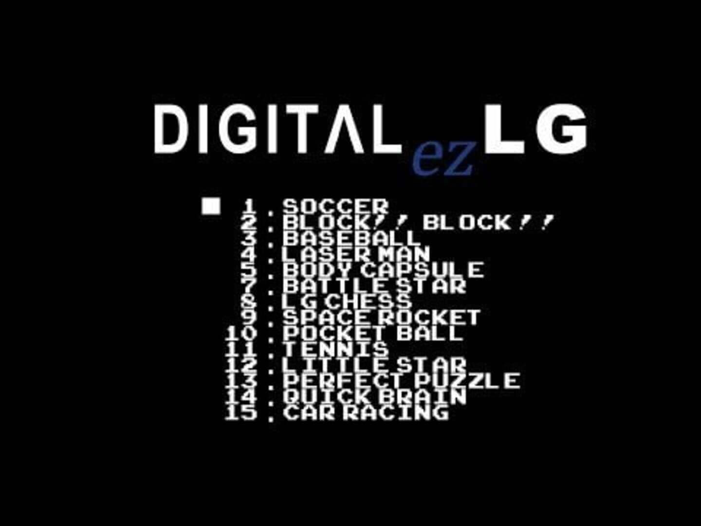 A bundle of NES games released in some models of LG Electronics TV around 2008. Most games are actually bootleg versions of famous NES games, with lots of aesthetic changes (and some gameplay changes in some cases). There are two exclusive games: LG Chess and Quick Brain. The games are: - Soccer (Nintendo World Cup) - Block!! Block!! (Arkanoid) - Baseball (Baseball) - Laser Man (Bomberman) - Body Capsule (Dig Dug) - Mobile Racing (Excitebike) - Battle Star (Galaga) - LG Chess - Space Rocket (Star Force) - Pocket Ball (Lunar Pool) - Tennis (Tennis) - Little Star (Antarctic Adventure) - Perfect Puzzle (Magic Jewelry) - Quick Brain - Car Racing (Road Fighter)