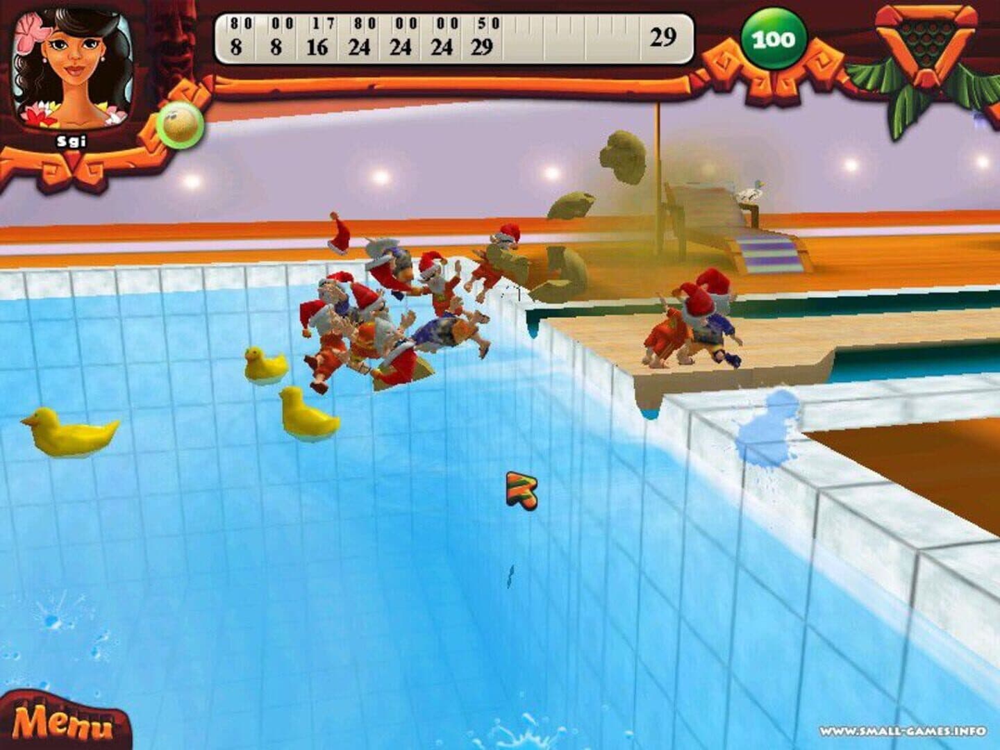 They're baaack! Yes, the elves have returned. This time, they have decided that the North Pole is a drag in the summer so they have stowed away aboard a yacht into the tropical Pacific. God help the Pacific. Players of Elf Bowling: Hawaiian Vacation will note similarities between it and Elf Bowling 7 1/7: The Last Insult. In both games, you are bowling elves and can direct the direction of the ball after it is thrown. In both games, you have bonuses to help you, like increasing the size of the ball, giving the ball super speed and shrinking the size of the gutters plus dirty tricks to use against your opponent, like increasing the gutter size, oil slicks and barriers on the lane and a cloud that makes the ball unchangeable after it is thrown. Hawaiian Vacation adds a story mode in which you can read the story then play a character in a best two out of three games. The story then continues and you play another, generally more skilled, character. You continue along the story until you are beaten in two out of three games or you reach the end of the story.