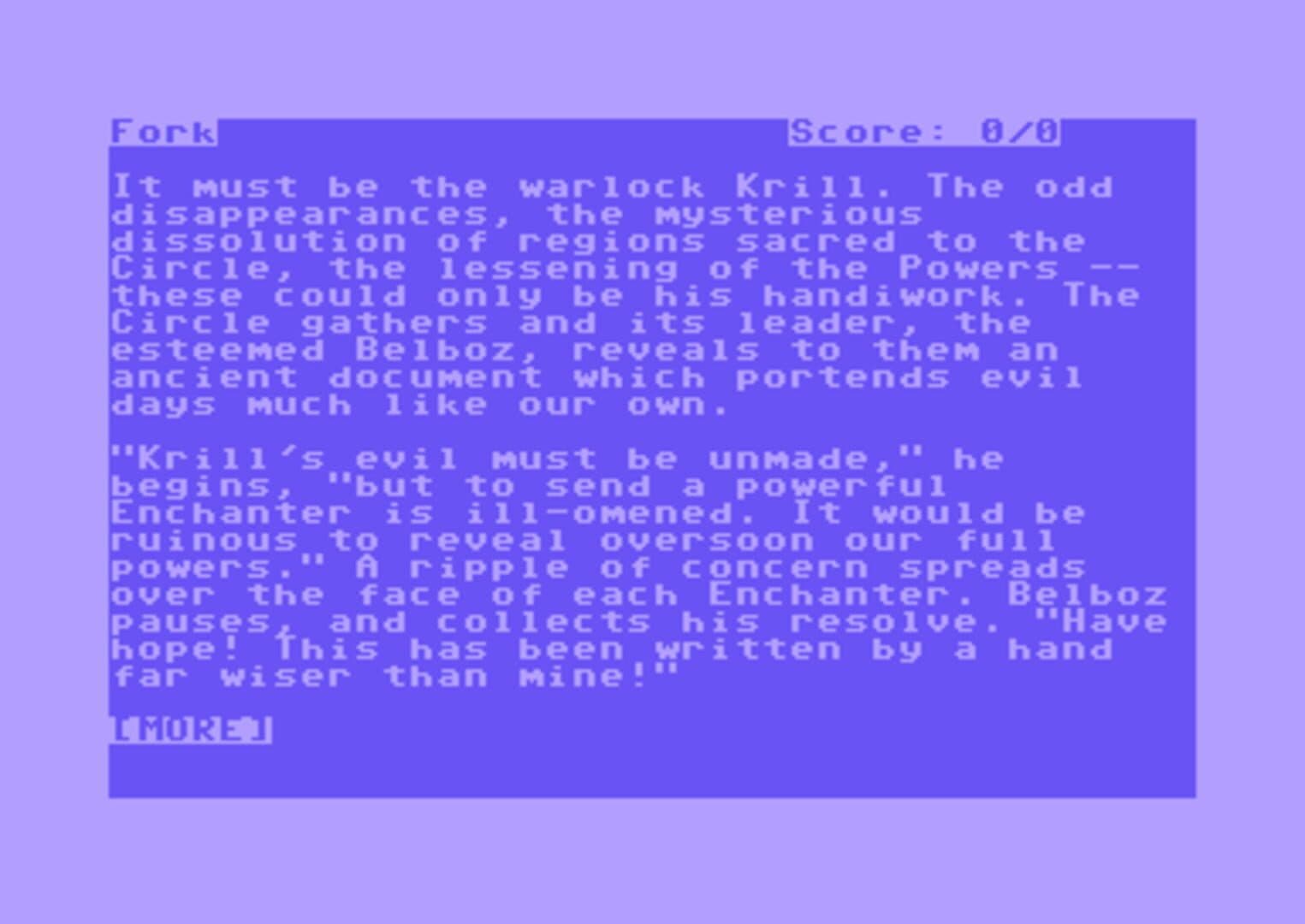 Enchanter is a 1983 interactive fiction computer game written by Marc Blank and Dave Lebling and published by Infocom. It belongs to the fantasy genre and was the first fantasy game published by Infocom after the Zork trilogy (it was originally intended to be Zork IV). The game had a parser that understood over 700 words, making it the most advanced interactive fiction game of its time. It was Infocom's ninth game. Krill, an incredibly powerful evil warlock, is spreading chaos and destruction. None of the more experienced members of the Circle of Enchanters dare to attempt to stop him. In desperation, the player, a novice Enchanter with only a few weak spells in his spell book, is sent in hopes that Krill will either fail to detect him or dismiss him as harmless. More powerful spells can be found on scrolls hidden in various locations, but as the player becomes more of a threat, Krill will respond accordingly. This game features an innovative new spell system based partially on Ursula K. Le Guin's Earthsea series and partially Dungeons and Dragons' Vancian spell system, where spells must be prepared through "memorization" before being cast. As in the Earthsea series, each spell is represented by some nonsense "magic word" which is treated as a verb by the game's text parser, so that one can use the FROTZ spell (which causes objects to glow and give off light) by typing >FROTZ BOOK, in exactly the same way as one might type >PICK UP BOOK or >READ BOOK.