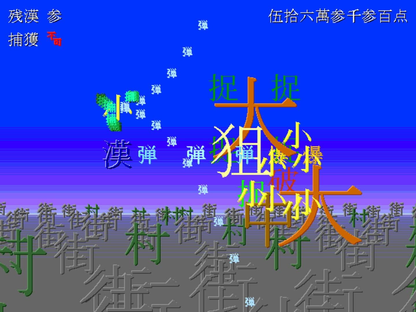 A unique side-scrolling shooting game in which all the graphics other than the background, such as your own plane and enemy planes, are written in kanji. Players use lock-on lasers and regular bullets to complete a total of 7 stages with a wide variety.