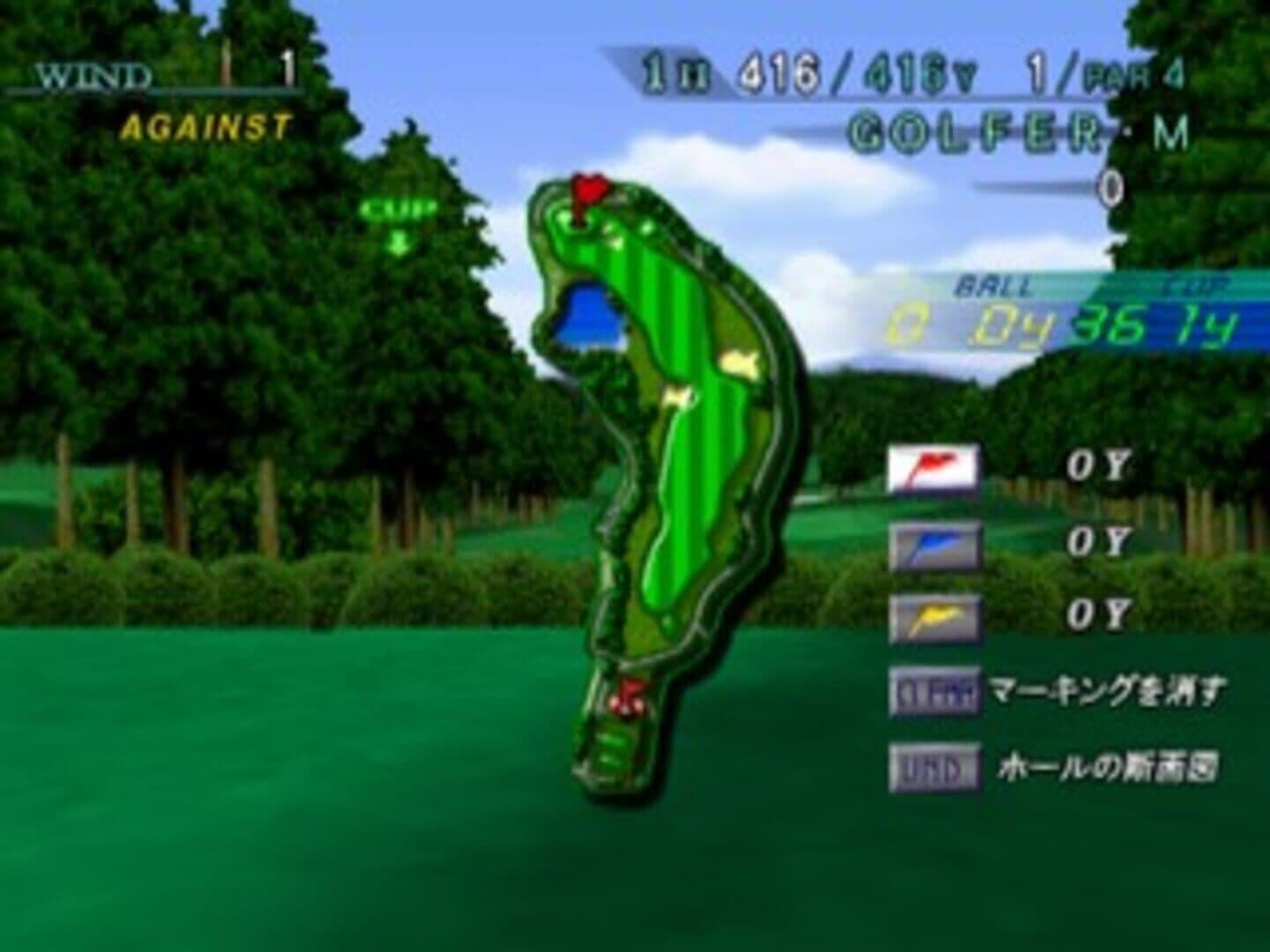 The Golf Navigator game series let's the player enjoy a golf simulation where the hallmarks are panoramic 360 degree views of the courses and an intuiative system which allows for proper impartation of power and english to the virtual golfer's swing. The Vol.4 features 2 courses: Taiheiyo Gotenba & Ishioka Golf Club. At the beginning of the game the player can choose between a male or a female caracter, select one of the courses and in each course he can play stroke play, free play or view the course data.