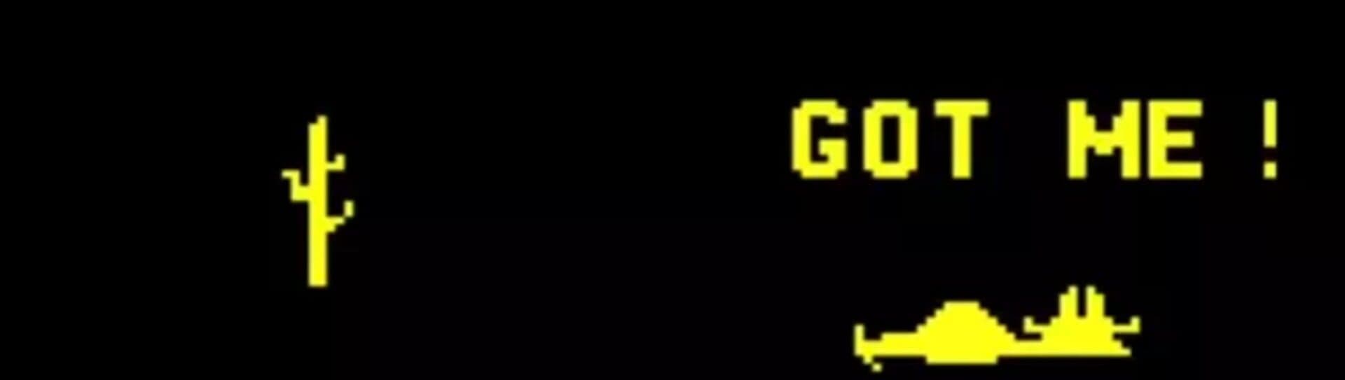 Old west theme shoot-out. Using simple graphics, two cowboys one on the left and one on the right move up down, left and right trying to get a clear shot avoiding cactus at the other.
