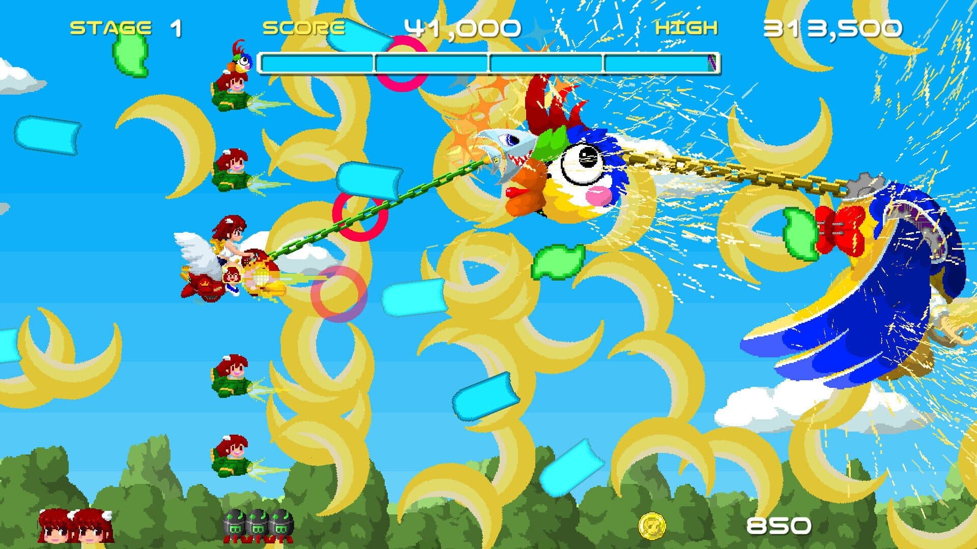 Shoot the harpoon and pull the enemies! Pull them in close and defeat for a higher score. For beginners, collect sweets instead of beeing attacked. You can enjoy retro and kawaii pixelarts, and deep game mechanics.