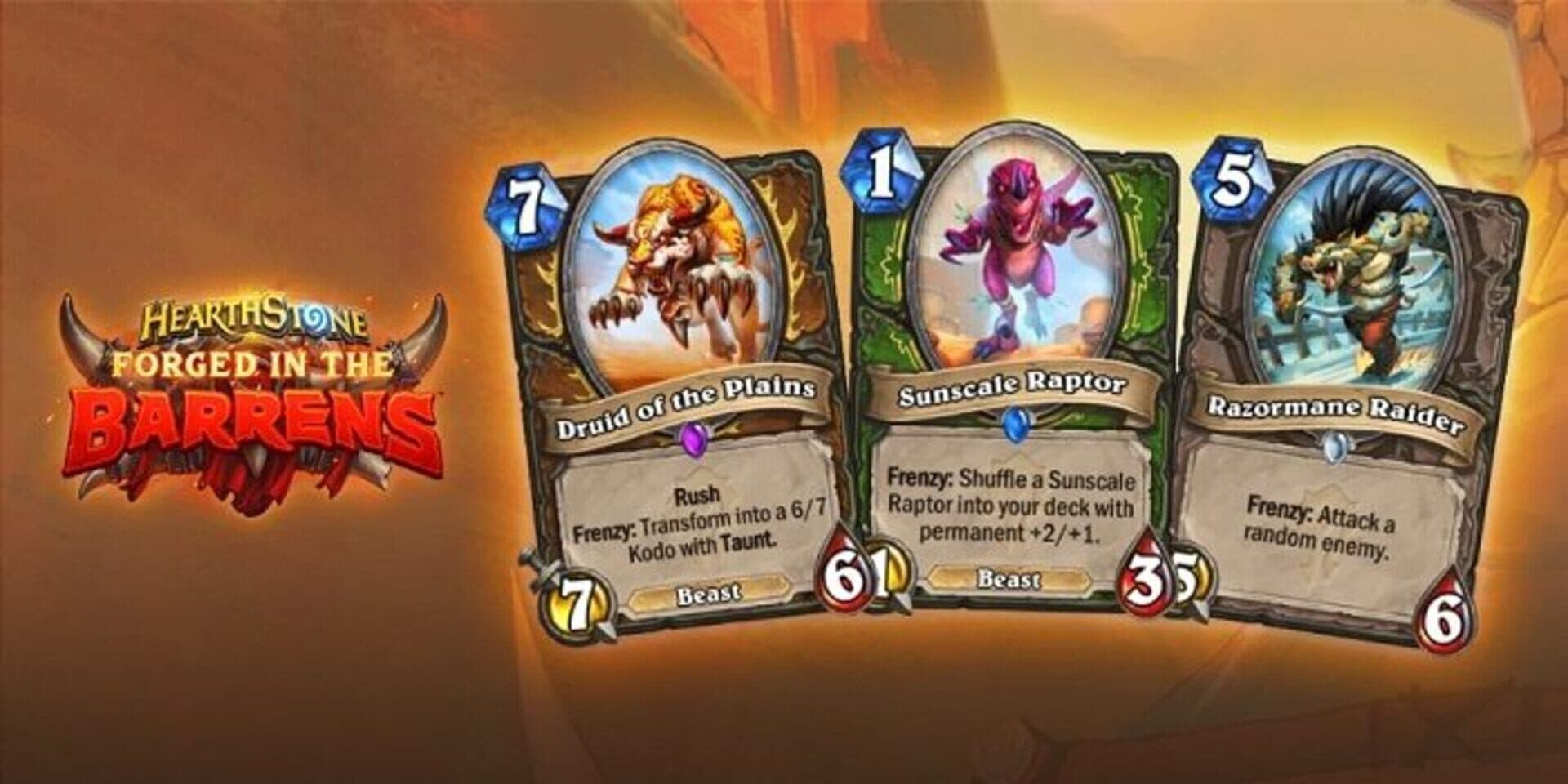 Forged in the Barrens will launch worldwide with 135 new collectible cards! Set in the dusty savannah territory of the Barrens, a literal crossroads where tauren, troll, and orc adventurers gather to prove their worth. Mercenaries of old and newcomers alike train for an upcoming conflict with the Alliance. This set introduced the new keyword, Frenzy, which causes a minion to do something the first time it takes damage as long as it survived the attack. Additionally, it added seven Spell schools to the game; Arcane, Fel, Fire, Frost, Holy, Nature, and Shadow. This applies to new spells but also old ones, opening up many new synergies.