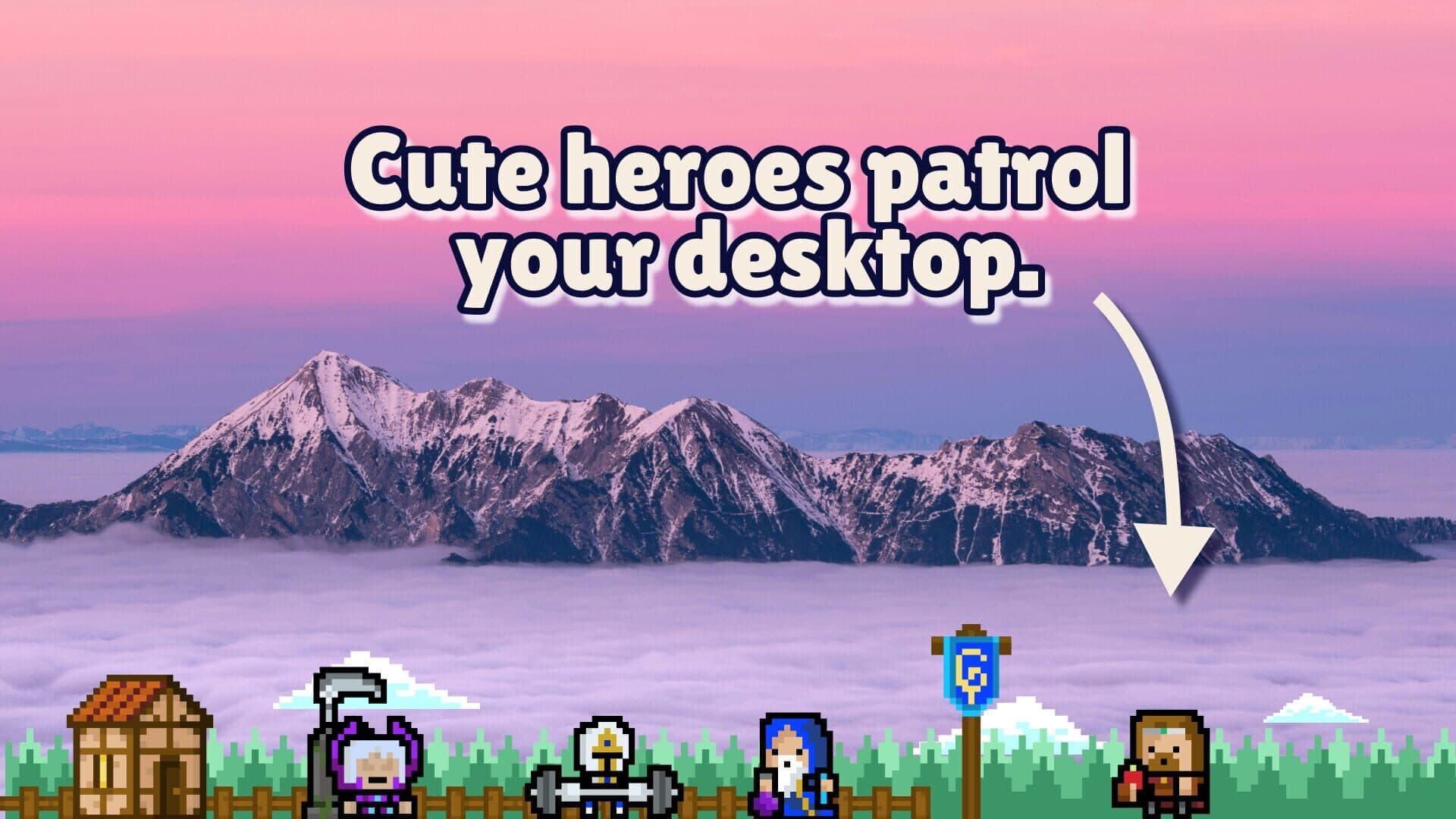 An idle desktop pet game where pixel RPG heroes patrol the bottom of your screen, collect loot, and level up while you work.