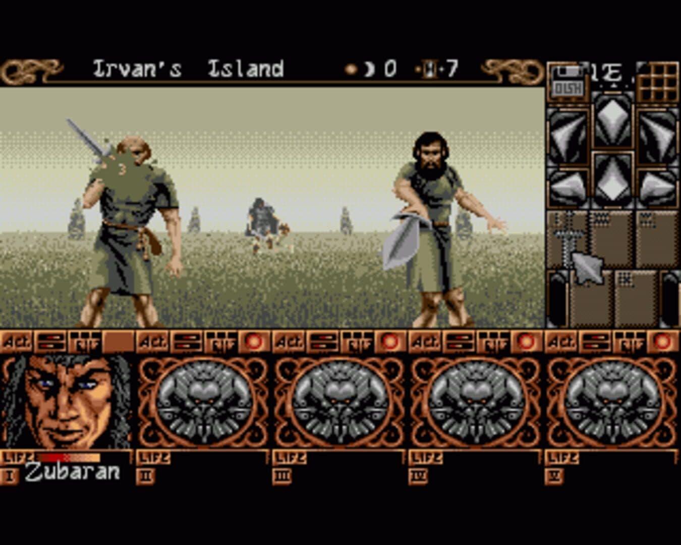 Ishar 2 was published in 1993 on Amiga, Atari ST and DOS. In Ishar 2, the player starts with the character of Zubaran, who is the new lord of Ishar. He receives a vision that tells him to defeat the sorcerer Shandar. It is also possible to import a party of characters from the first Ishar. The game now takes place on an archipelago, each island bearing the name of one of Jarel's companions. Each island also features a different type of landscape: Irvan's island is covered with swamps, Akeer's and Otbar's are underground complexes, Zach's island is covered by a city, Jon's is mountainous, and Thorm's has treetop gangways in a forest. This game has a combat system that's more ergonomic than in the first Ishar, and a day-night cycle in which shops are closed at night and the nightclub is closed by day. It also adds a bank (let's leave it to players to figure out what to do with it). Saving the game does not remove gold from the player any more.