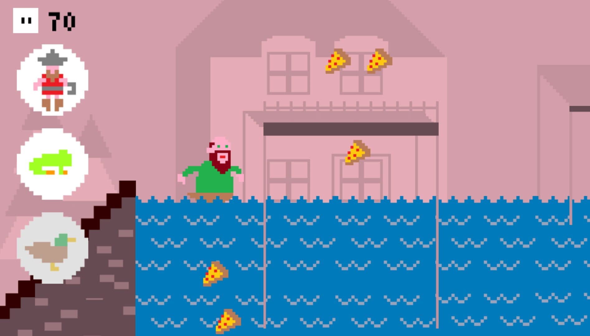 I've Got A Brand New Pair Of Legs is a puzzle-platform game where you must figure out the best selection of legs to use to traverse each level! Chris wants to get from point A to point B and he wants to eat his share of pizzas on the way. But the environments are dangerous and can not be traversed with human legs alone... Thankfully, Chris has the power to replace his legs on the fly! That pizza is too high up; giraffe legs make Chris tall. Chris can't breath in water; duck legs make Chris float. There are spikes on the floor; frog legs make Chris jump. These are just a few of the types of legs to help Chris on his way! Chris is very clumsy; if he collides with an obstacle or bumps his head, he'll lose a pair of legs! This will hinder your ability to complete the level. Some levels can only be finished with certain legs, so you'll have to figure out which legs are most suitable based on the types of traps you encounter.