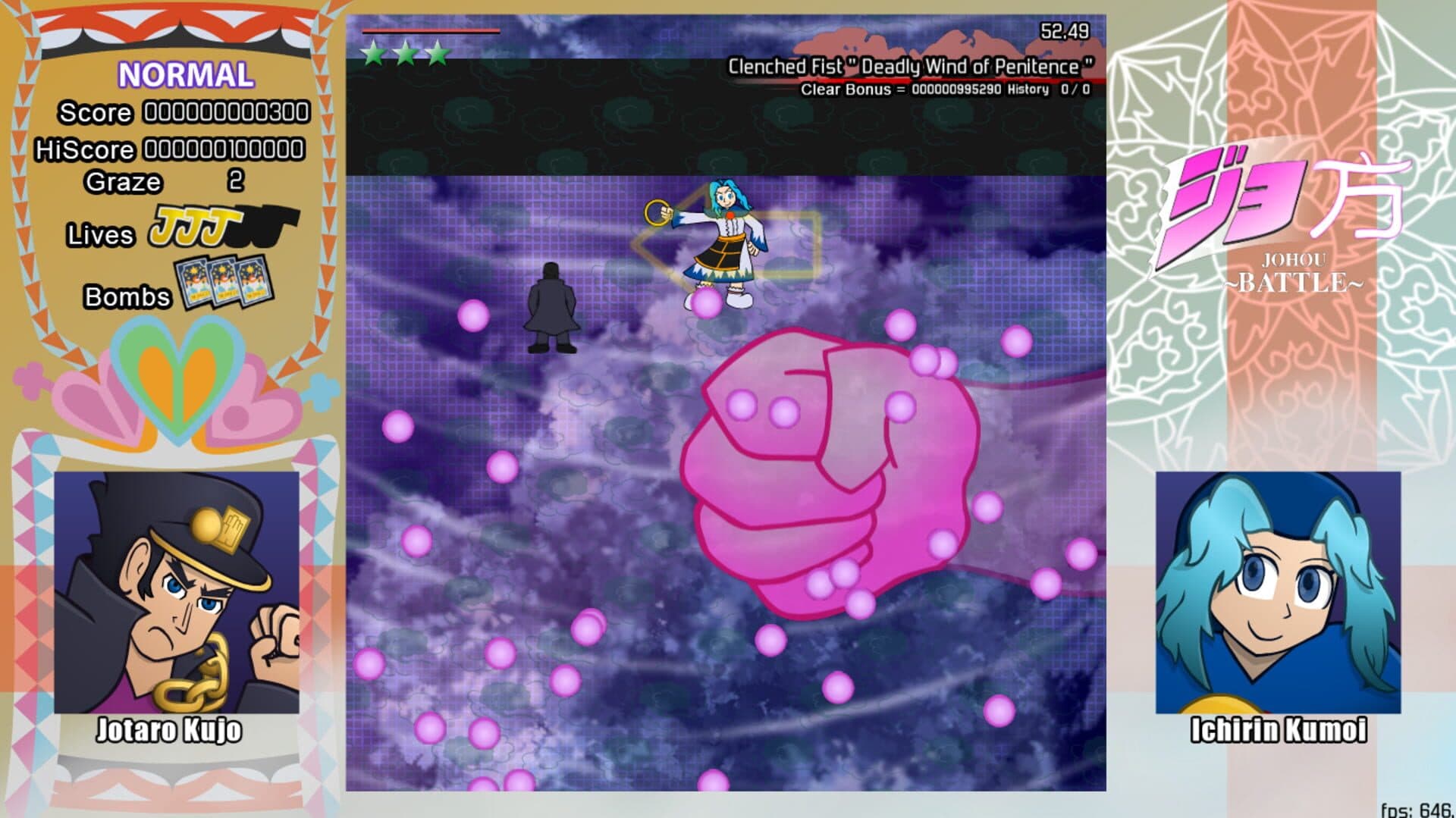 Johou Battle is a bullet hell shoot 'em up game putting you in the shoes of Jotaro Kujo, the legendary fighter of Jojo's Bizarre Adventure fame or Ichirin Kumoi, a fighting spirit from Touhou Project, and pits you against the other! Take on a barrage of attacks based on those seen in Jojo's Bizarre Adventure: Stardust Crusaders and Touhou Project: Hopeless Masquerade in this challenging yet loving tribute to the two franchises!