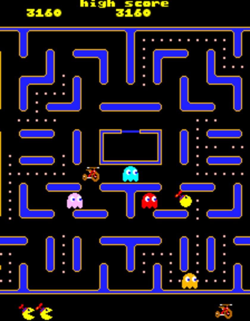 The gameplay of Jr. Pac-Man is similar to that of its predecessors: The player controls the titular Jr. Pac-Man and scores points by eating all of the dots in the maze. Four ghosts roam the maze and attempt to capture him. The player can eat an energizer to turn the ghosts blue, making them vulnerable for a short time and allowing the player to eat them, sending their eyes back to their home base. When all the dots are cleared, a new maze is presented and gameplay resumes.