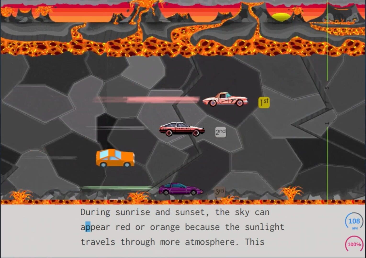Players compete by racing in cars that advance down the track as the users type passages. Klavia is not meant to teach players how to type, but is used to increase accuracy and WPM. In a race, a player must type the words on the screen. In each race, there is one boost word that increases the distance each correct keystroke propels a user's car.